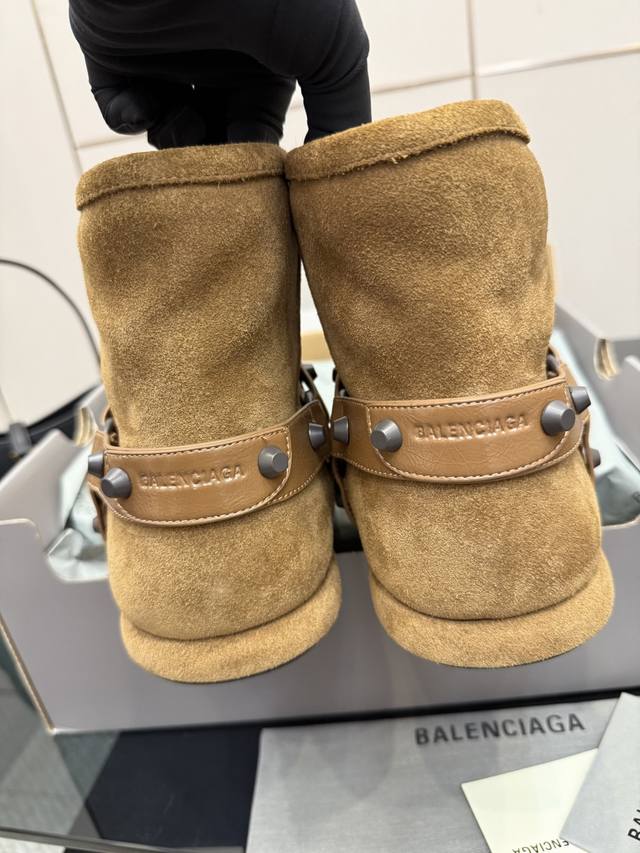 Balenciaga2025秋冬新款皮带扣铆钉雪地靴 简直不要太帅 设计感满满打破传统雪地靴的沉闷臃肿 个性十足 鞋面采用丝光牛反绒面料 细腻高级感拉满 整个内
