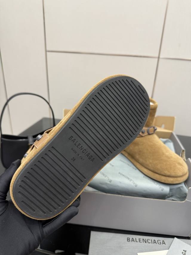 Balenciaga2025秋冬新款皮带扣铆钉雪地靴 简直不要太帅 设计感满满打破传统雪地靴的沉闷臃肿 个性十足 鞋面采用丝光牛反绒面料 细腻高级感拉满 整个内里采用纯羊毛 保暖舒适 橡胶大底防滑耐磨 给潮湿的冬季加上一层安全锁 穿上安全感满满 Size:35-40 40定做