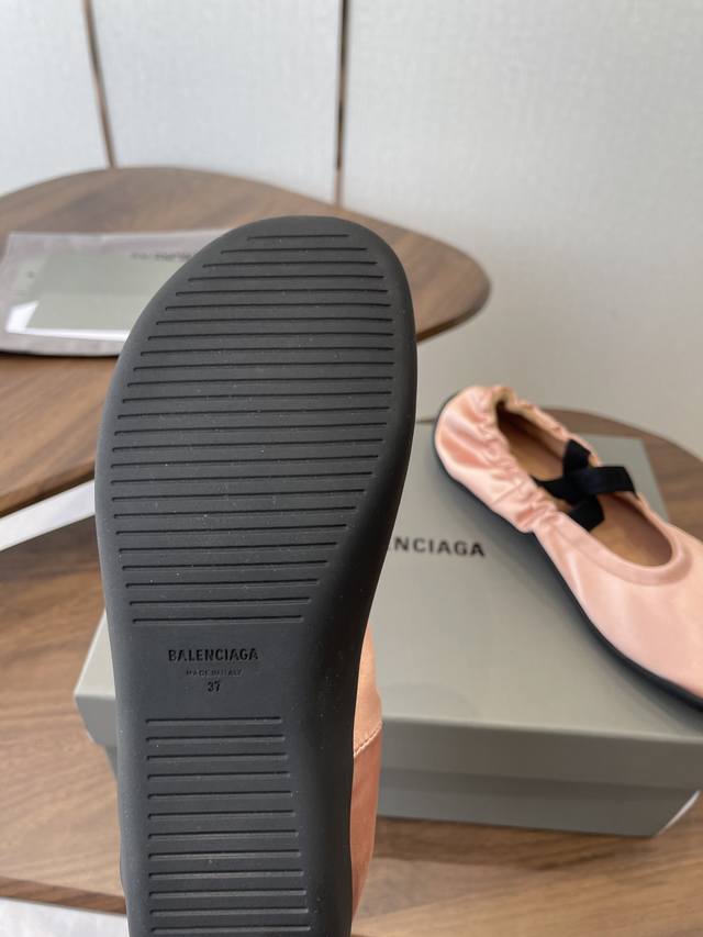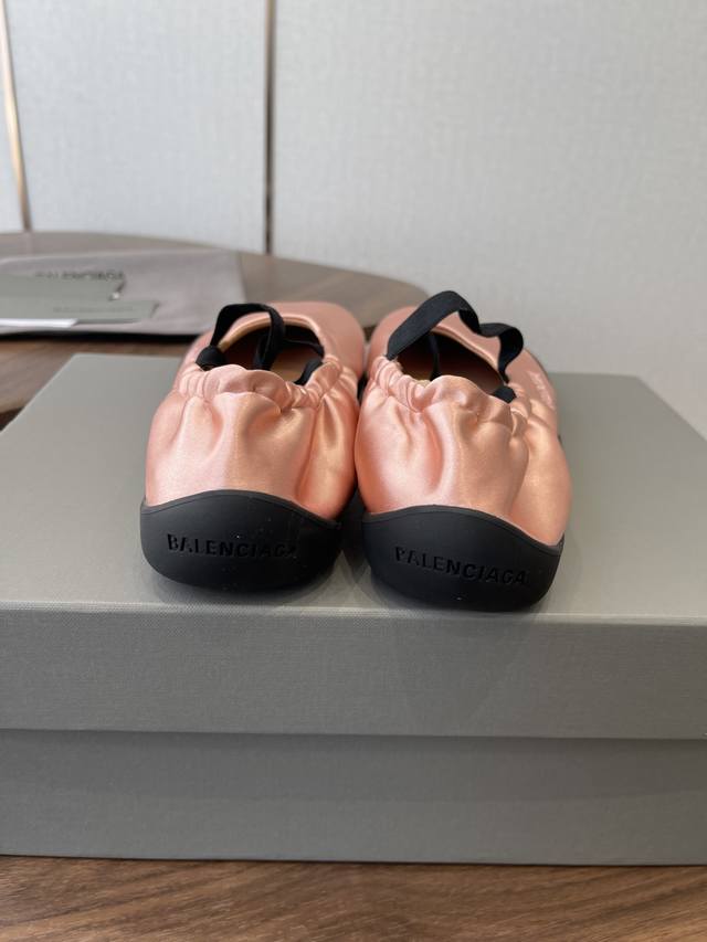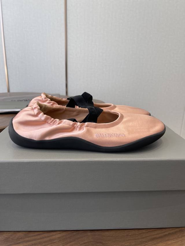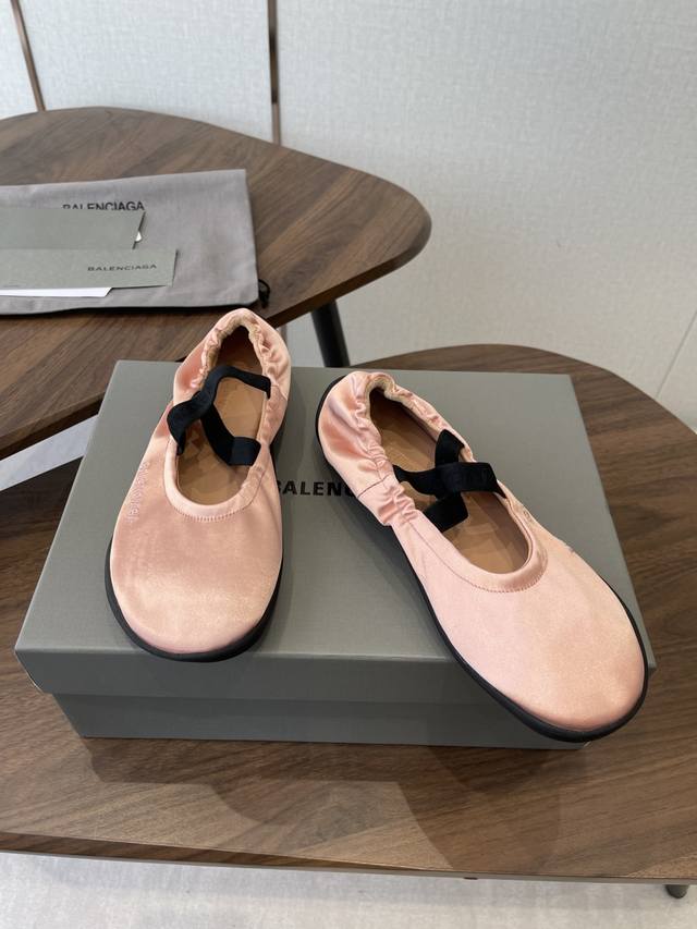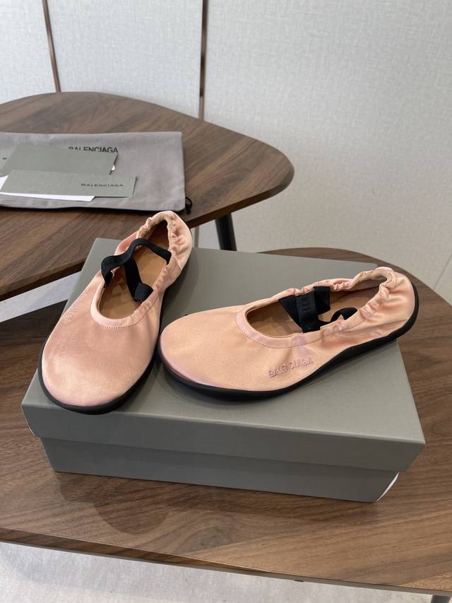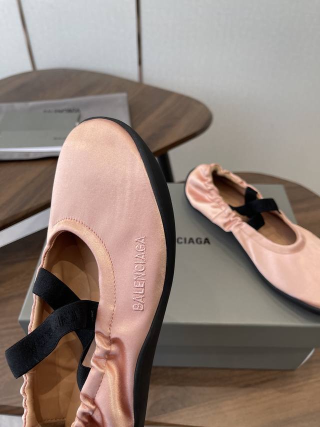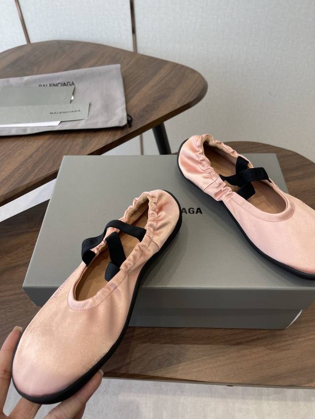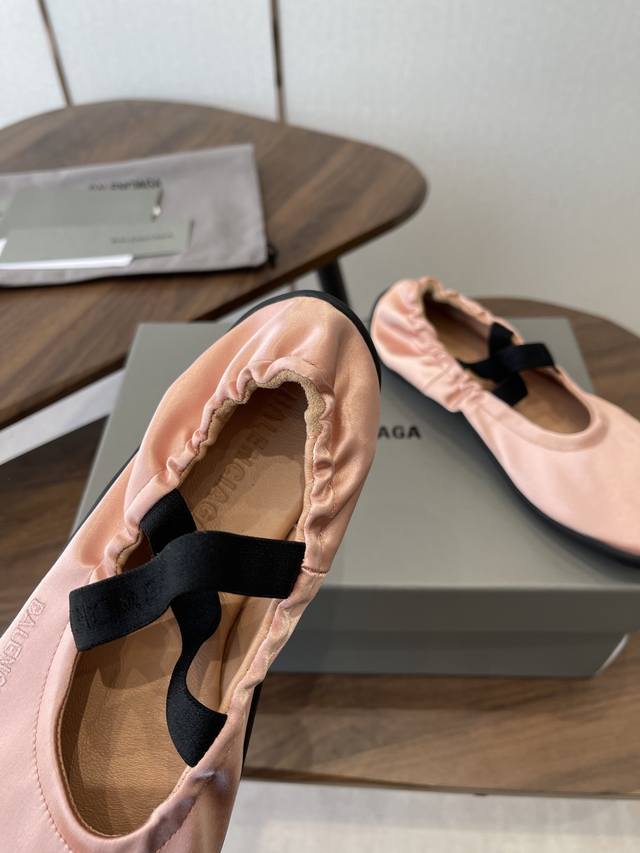 FFF Balenciaga26Ss经典圆头平底松紧绑带芭蕾舞鞋 DDD 复刻经典芭蕾舞鞋版型,圆头+浅口设计,搭配交叉松紧绑带,既保留芭蕾鞋的优雅感,又融入品牌街头潮流调性;鞋身侧面压印低调的Balenciaga字母标识,辨识度暗藏细节里。 DDD 鞋型为软底平跟设计,鞋底采用弹性橡胶材质,弯折性好,长时间行走无负重感;宽楦鞋头对脚型包容度高,脚宽、脚胖人群也能适配。松紧绑带的弹性设计,穿脱便捷且能贴合不同脚踝粗细,兼顾美观与实用性。 DDD 鞋面:绸缎 DDD 内里:羊皮 DDD 大底:橡胶大底 DD