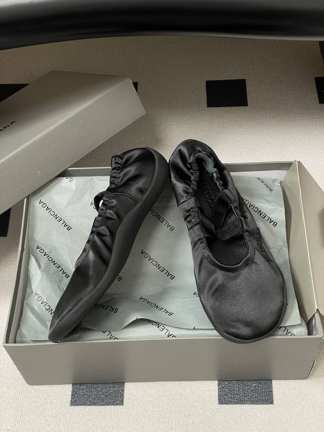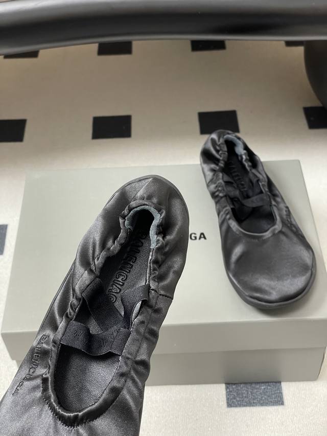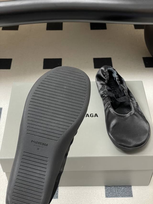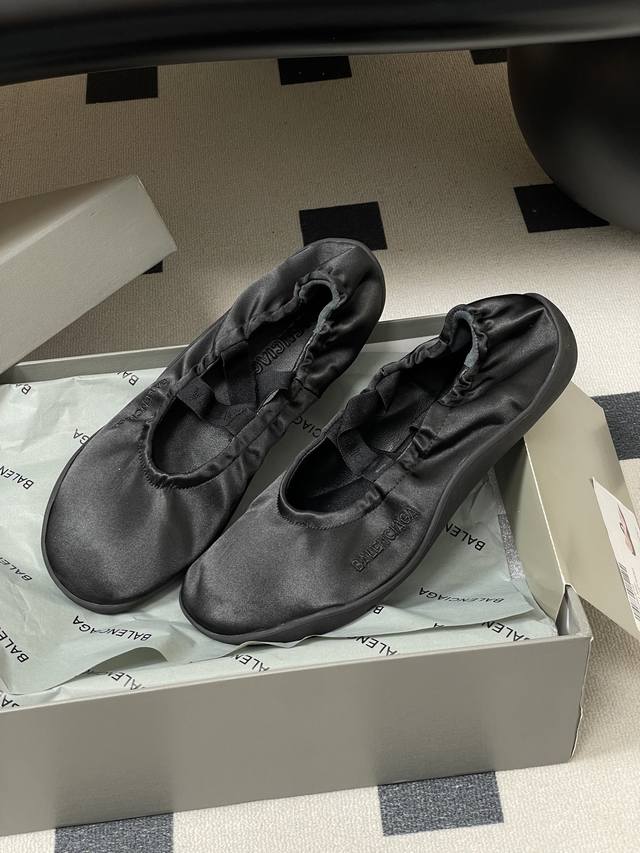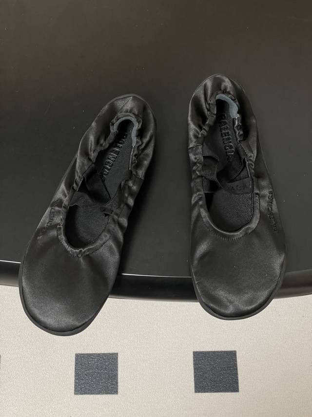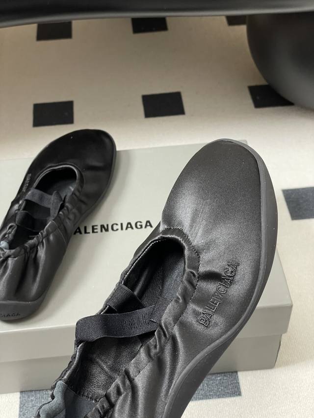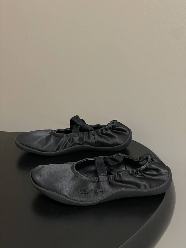 FFF DDD Balenciaga巴黎世家26Ss春夏新款经典圆头平底松紧绑带芭蕾舞鞋交叉带跳舞鞋 DDD 复刻经典芭蕾舞鞋版型,圆头+浅口设计,搭配交叉松紧绑带,既保留芭蕾鞋的优雅感,又融入品牌街头潮流调性;鞋身侧面压印低调的Balenciaga字母标识,辨识度暗藏细节里。 DDD 鞋型为软底平跟设计,鞋底采用弹性橡胶材质,弯折性好,长时间行走无负重感;宽楦鞋头对脚型包容度高,脚宽、脚胖人群也能适配。松紧绑带的弹性设计,穿脱便捷且能贴合不同脚踝粗细,兼顾美观与实用性。 DDD 鞋面:真丝绸缎面料 DD