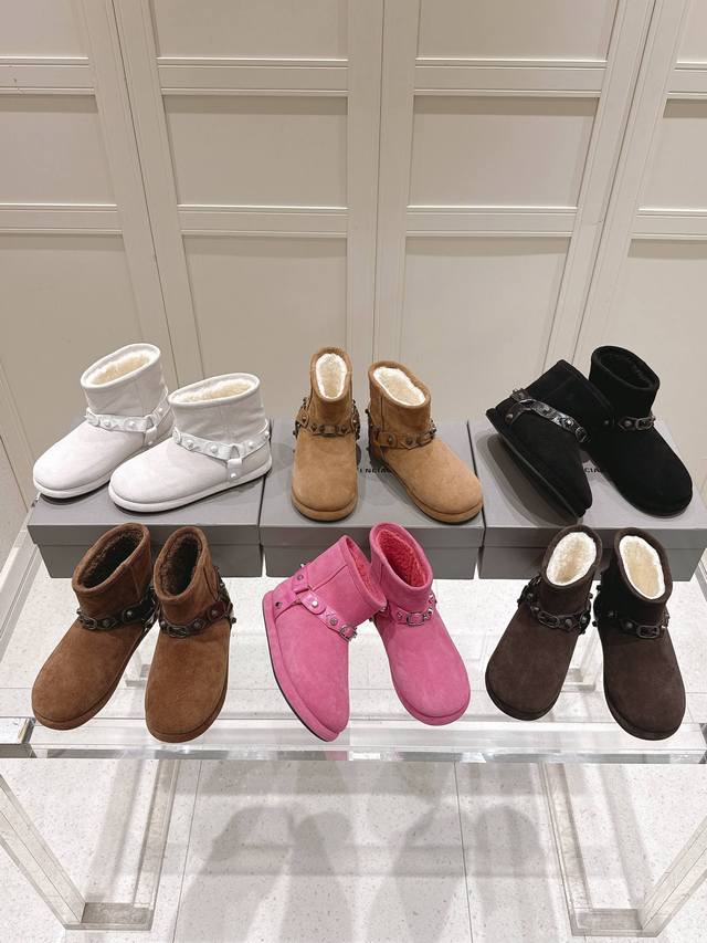 巴黎世家 Balenciaga 2025秋冬新款皮带扣铆钉雪地靴,一眼沦陷的率性美学 打破传统雪地靴的沉闷印象,利落廓形丝毫不显臃肿,铆钉与皮带扣点缀出高级街头感,每一步都踩在时髦尖端。 鞋面选用丝光牛反绒,触感细腻,光泽低调奢华。内里100%纯羊羊毛包裹,轻盈保暖,仿佛踏在云朵上橡胶大底防滑耐磨,湿冷冬季也能安心行走。 栗色|黑色|白色|棕色|粉色|深咖 尺码35-40,专为追求质感与风格的你准备。 这个冬天,要温度,更要风度。