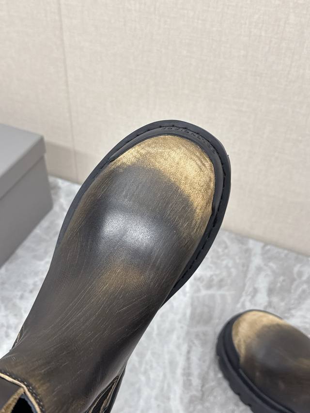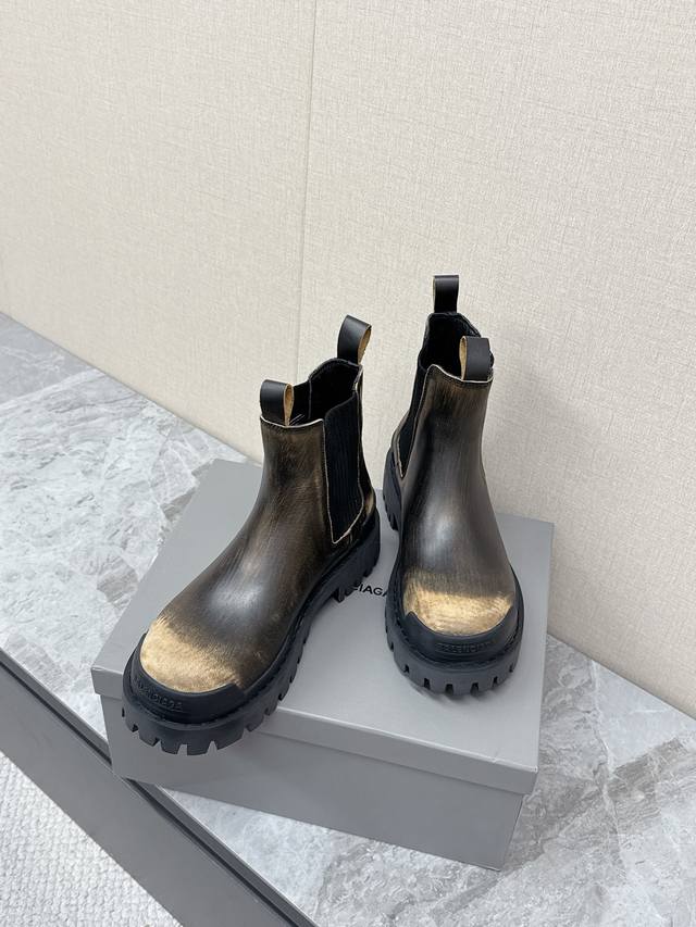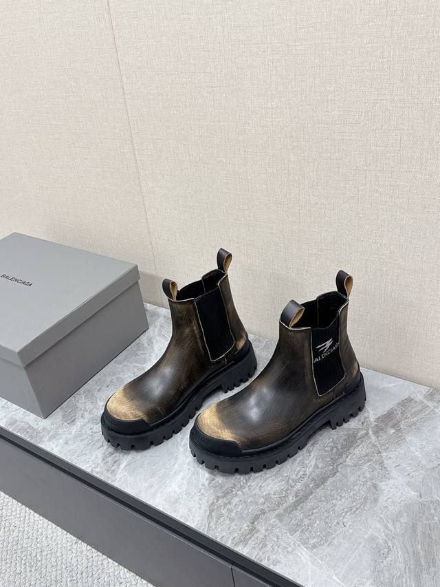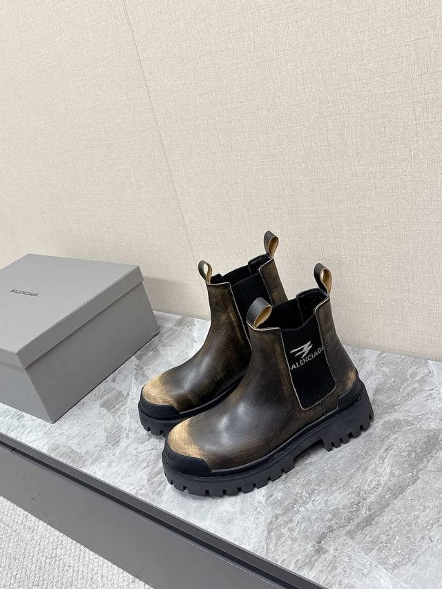 Balenciaga巴黎世家秋冬最新款情侣高帮 做旧复古风格,以崭新视角演绎“中古风”黑色百搭经典配色 大底鞋头处有品牌Logo 鞋身特殊皮料采用做旧水染擦色工