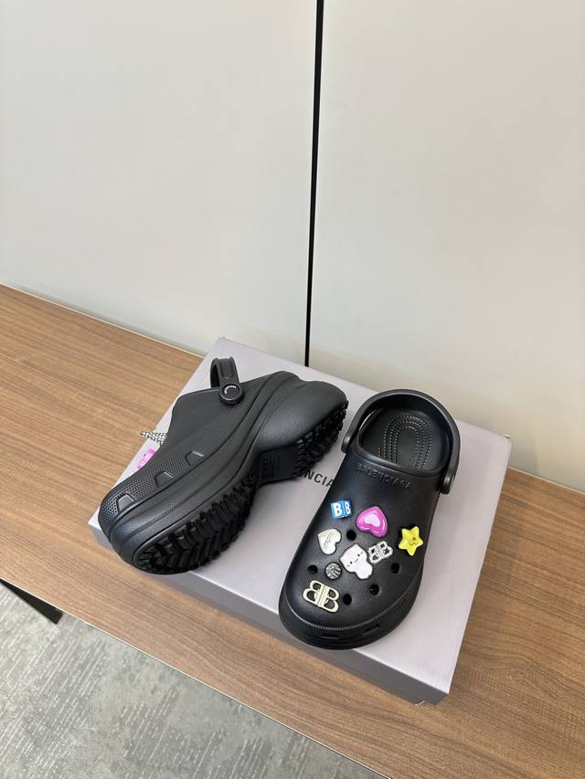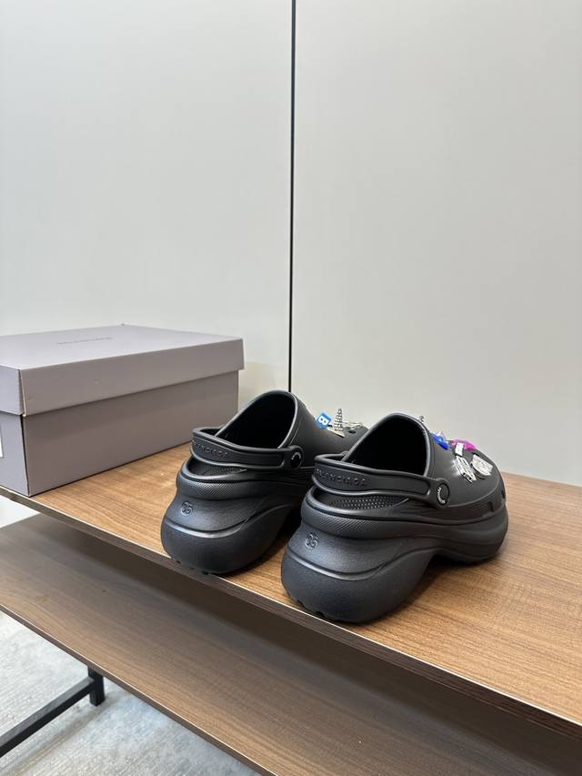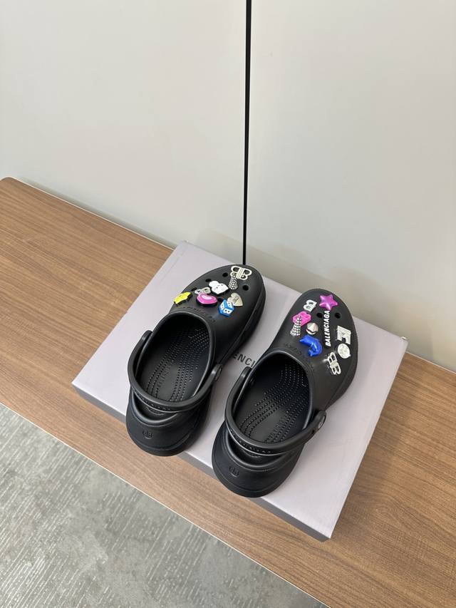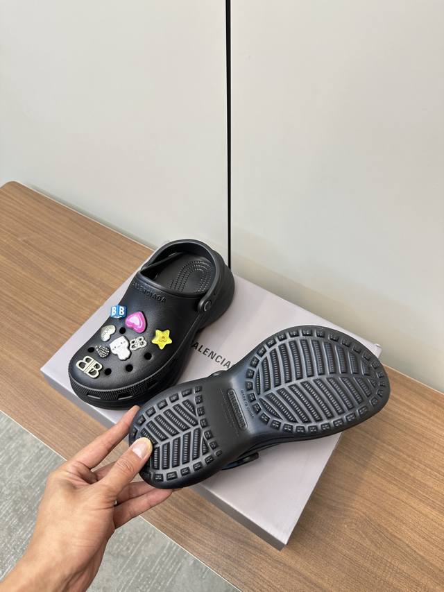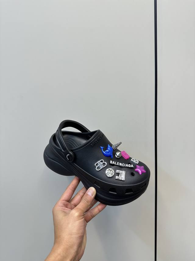 Balenciaga×Crocs 呆萌可爱款,巴黎世家夏季洞洞鞋, 原鞋购入开发,11厘米厚底,鞋底银色金属装饰并凹印Bbbalenciaga品牌标识,圆钉镌刻Bb标识,全套配件及包装,官方正确版原装级,原版一致细节。 尺码:35 36 37 38 39 40 41
