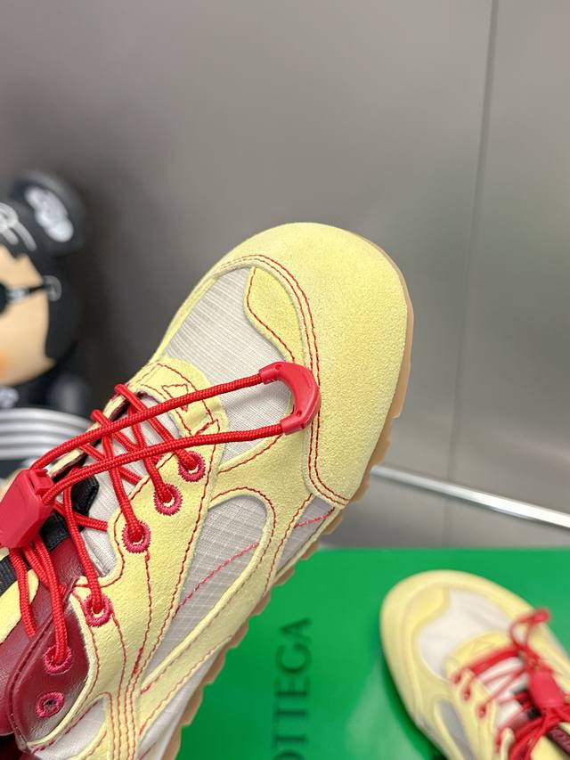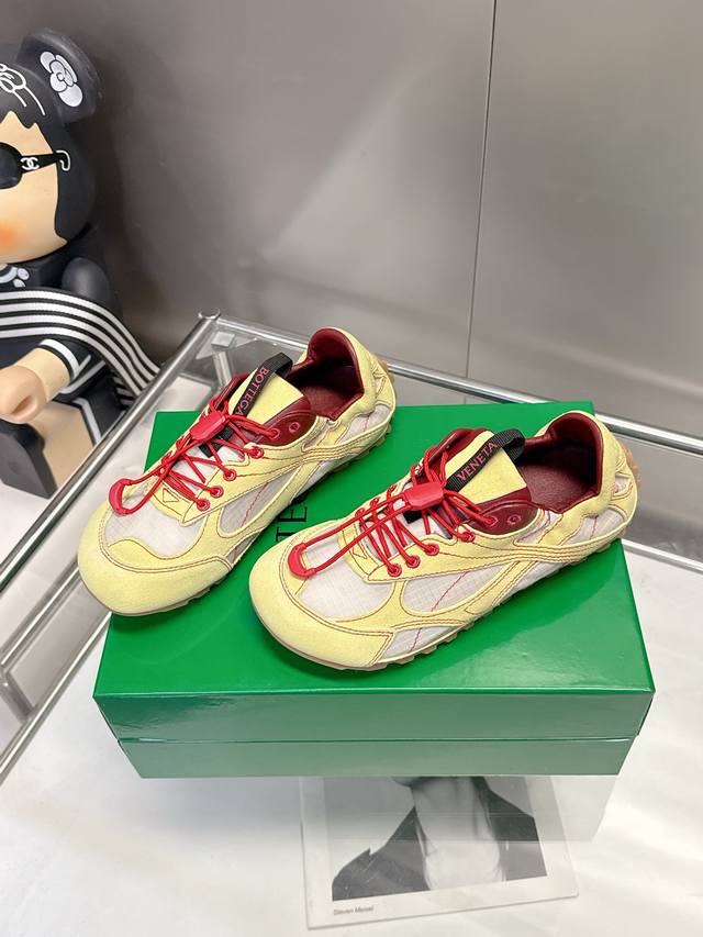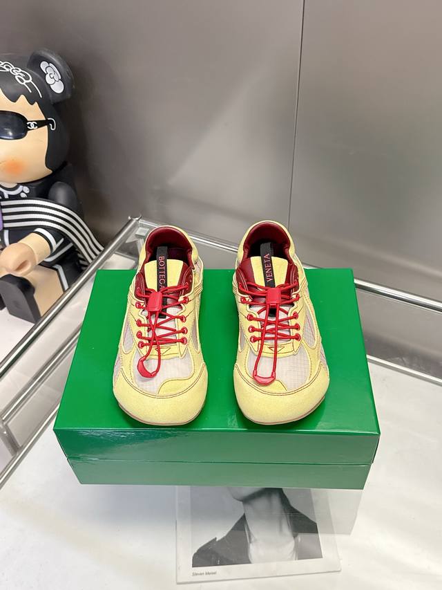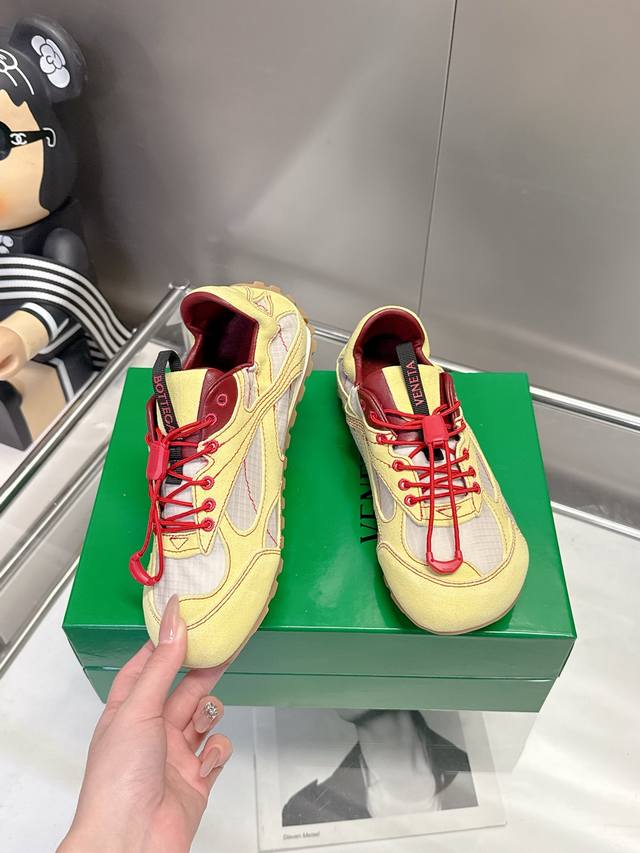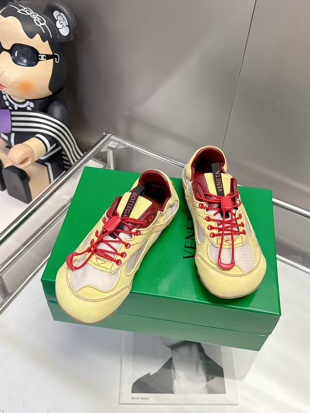 FFF 厂价P: 码数5-40 定制41男码晚些才出 DDD Bottega Veneta 2026春季网面运动鞋,以先锋设计揉合户外机能与都市摩登,为春日步履赋新。 DDD 鞋面采用轻量透气网眼织物拼接手工做旧反绒牛皮,网面织法经工坊调试,透气与肌理感兼备;反绒牛皮的复古质感,赋予每双鞋独有的手工温度。流体美学鞋身搭配防滑橡胶大底,极简轮廓中藏着实用巧思,鞋舌压印品牌标识,低调彰显身份。 DDD 本季以 都市游牧 为灵感,打破风格边界:黑红配色冷峻前卫,米白款简约柔和,黄红撞色鲜活明媚,三款配色皆成造型