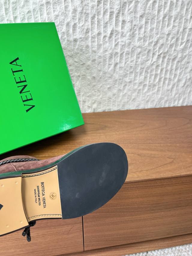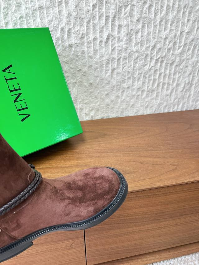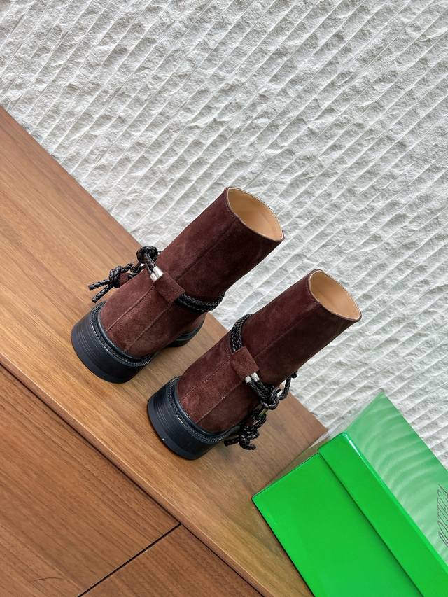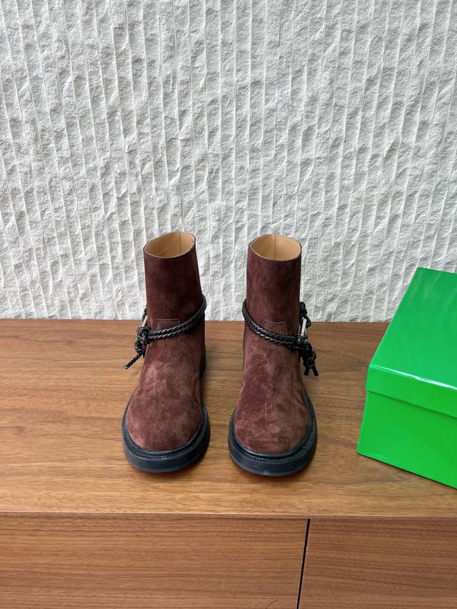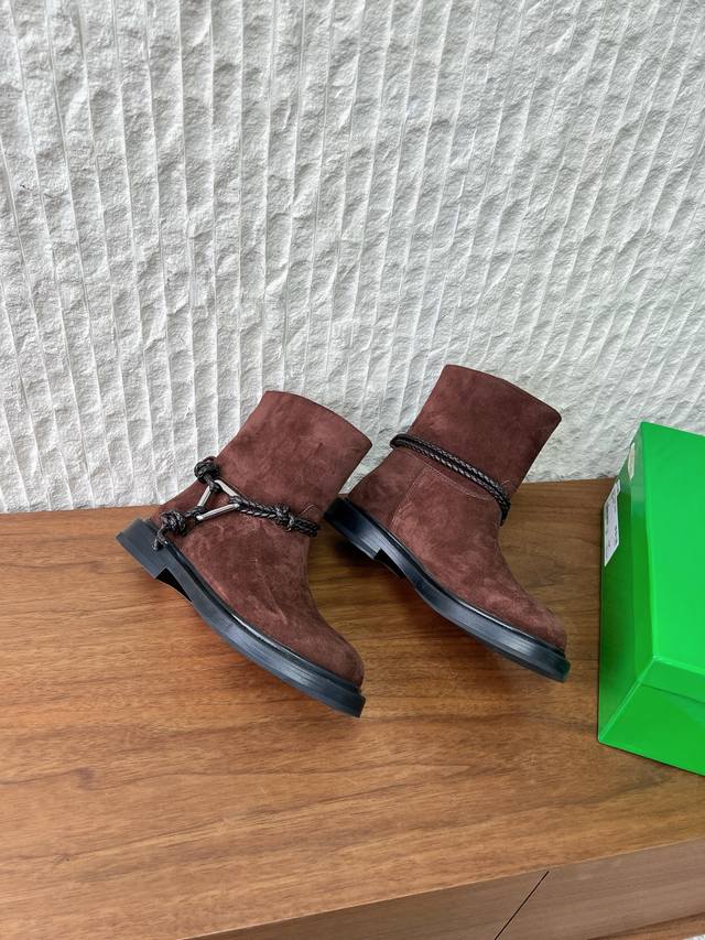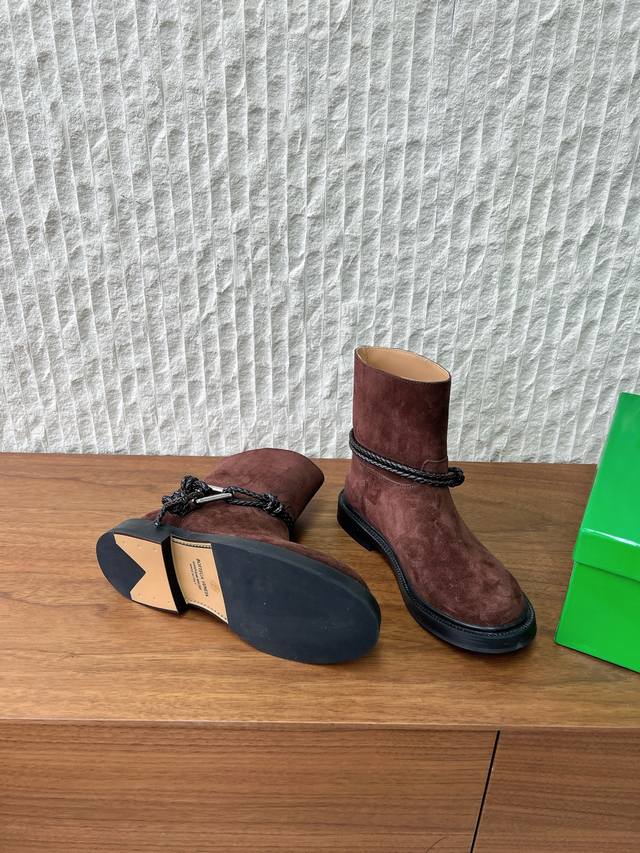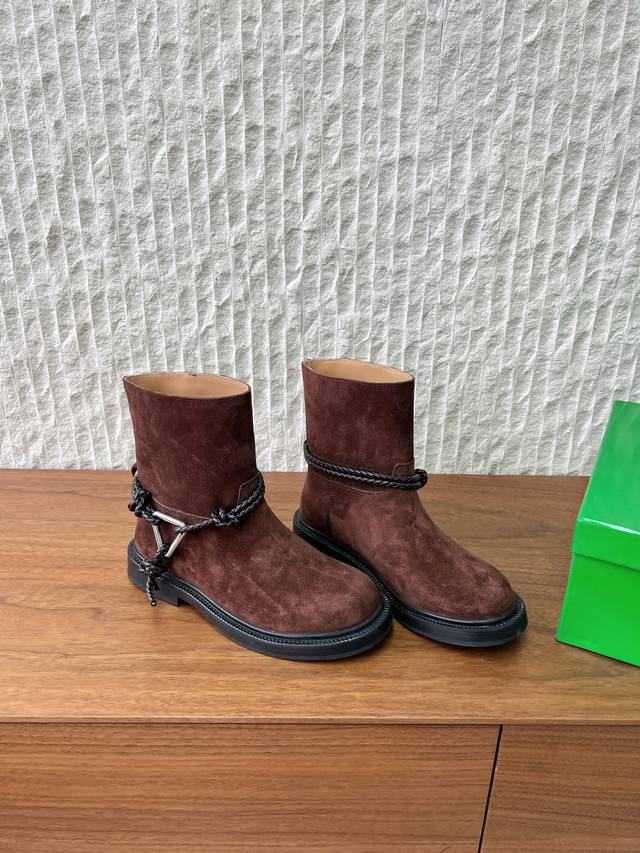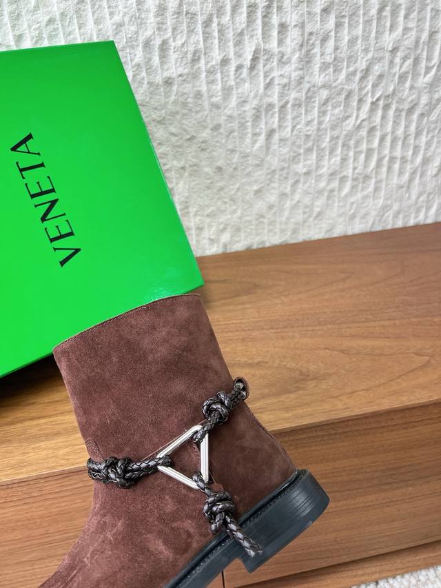 短靴 G266 Bottega Veneta 葆蝶家 25Ss秋冬新款 绳结靴 骑士靴 短靴 DDD 秋冬“战靴”预定,时尚人都在抢淡Bv 女孩看过来!这双绳结靴必须锁死 DDD 经典绳结编织缠绕靴身,搭配标志性三角金属扣,黑银碰撞自带酷飒滤镜,穿上直接化身街头拽姐,气场两米八 DDD 型超显腿长,不管是配拖地走随性松弛感,还是搭迷你裙玩辣妹风,甚至配西装裤走职场精英路线,都能完美适配,秋冬穿搭“万能钥匙”就是它 DDD 纠结秋冬的姐妹,闭眼冲! DDD 鞋面:采用原版进口高丝光反绒皮 DDD 内里垫脚: