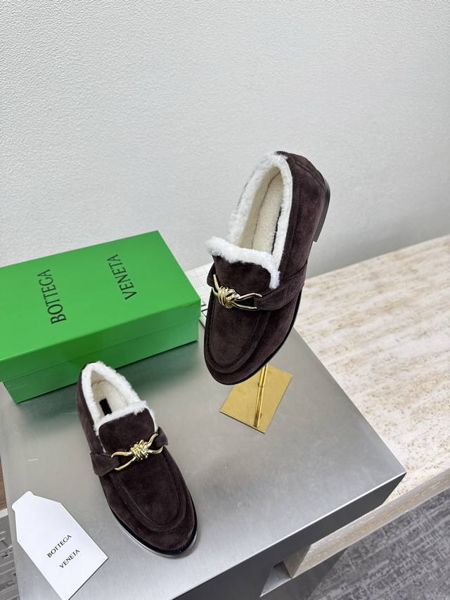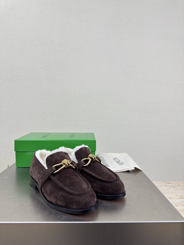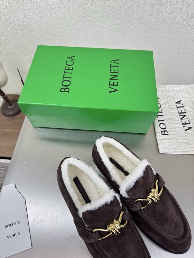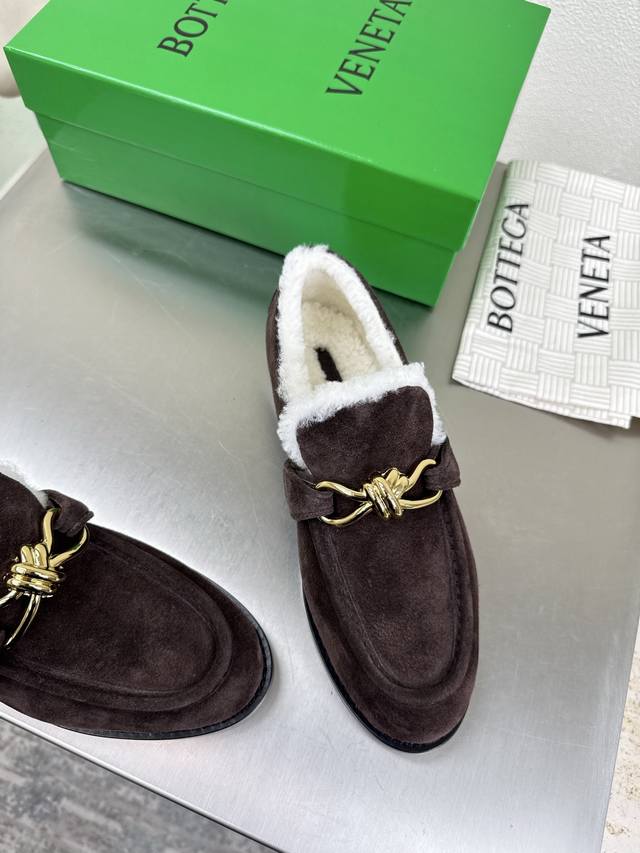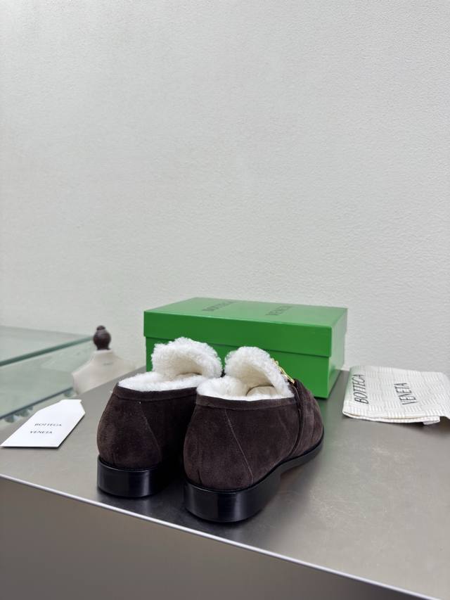 羊羔毛鞋里 金属鎏金扣件装饰 Bottega Venet* 女士Astaire乐福 毛里单鞋 原版一比一做法 皮扣 咖啡色 高丝光牛反绒皮 内里 羊羔毛 微卷系