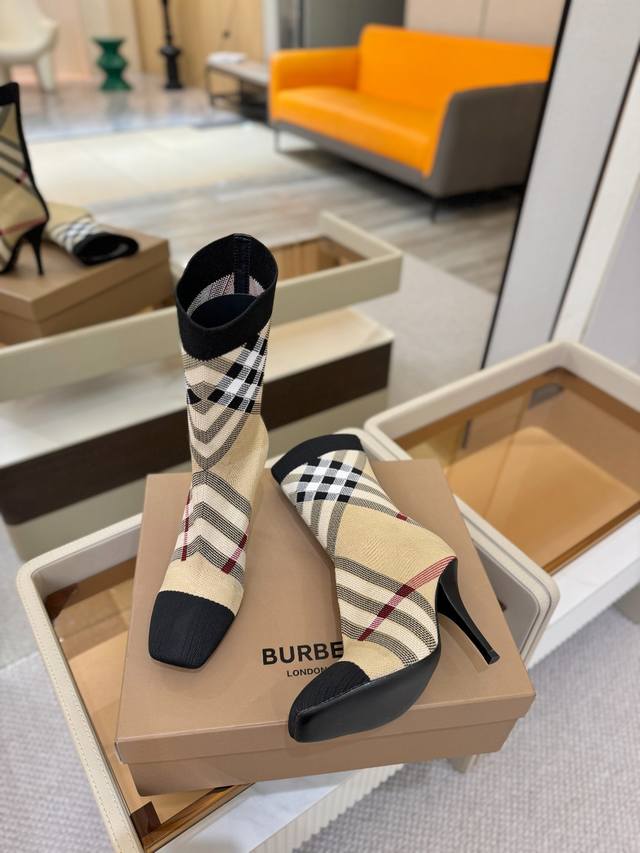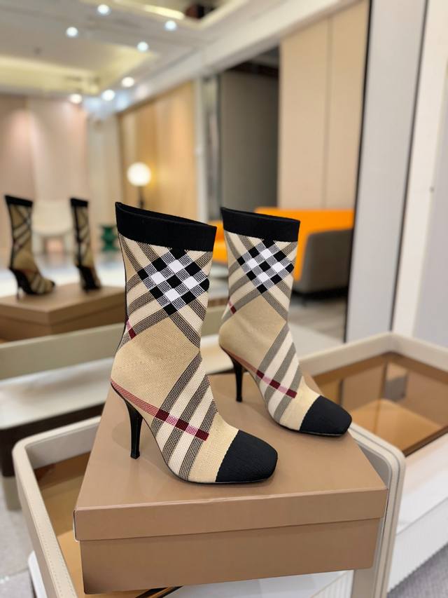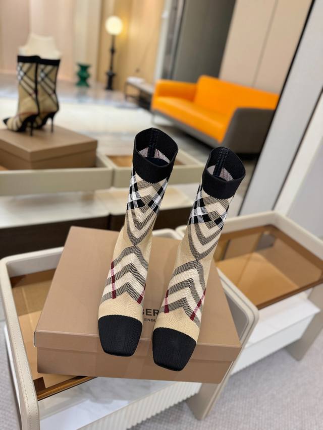 / 价格p: 博柏利 独家 推出方头细跟格纹弹力针织袜长靴 Burberry博柏利英国奢侈品牌,典藏米色,原版1:1复制,贴身弹力针织式及膝靴,设计圆形靴头粗跟,装