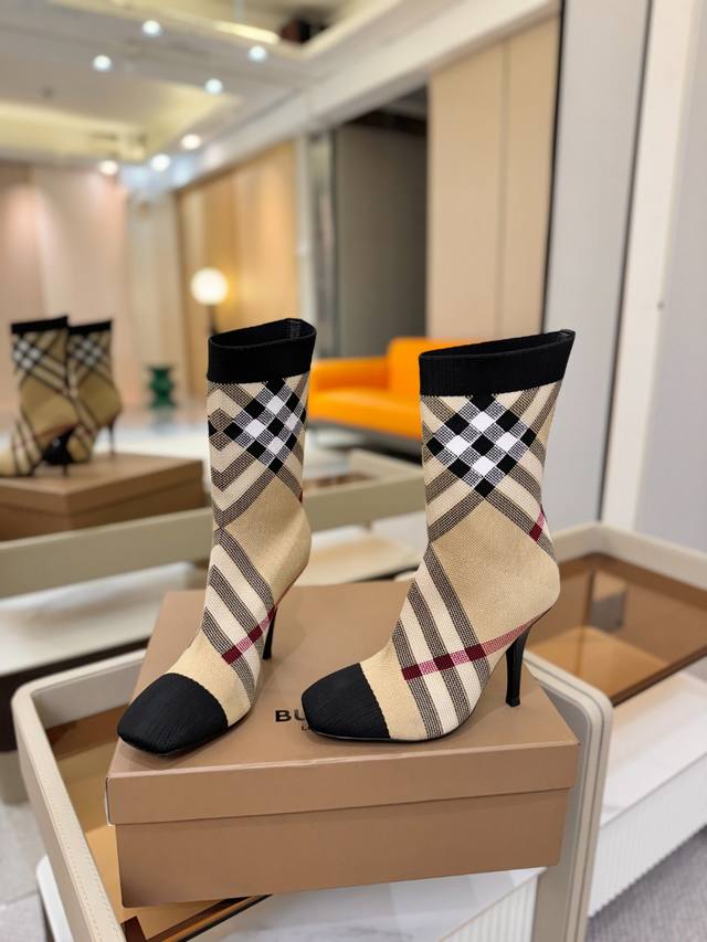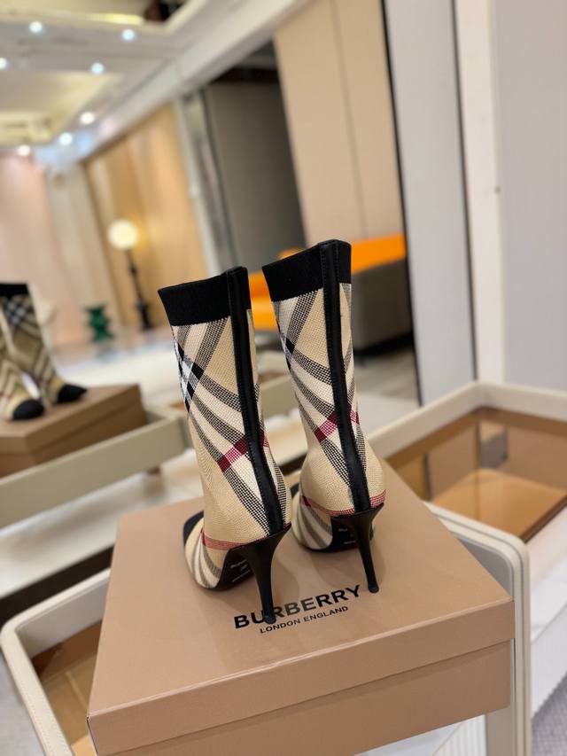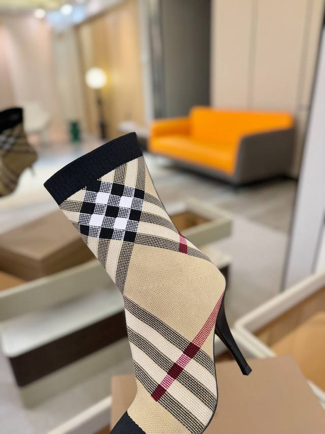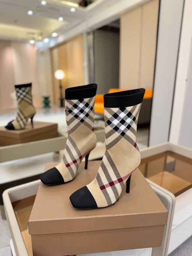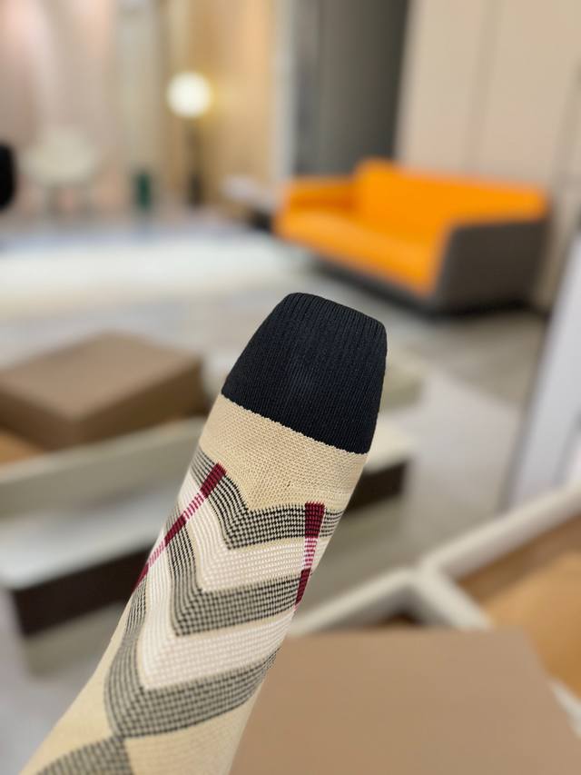出厂价P 博柏利 独家 推出方头细跟格纹弹力针织袜长靴...