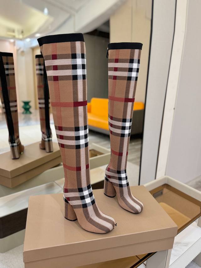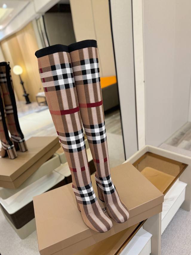 / 价格p: 独家推出圆头粗跟格纹弹力针织袜长靴 Burberry博柏利英国奢侈品牌,典藏米色,原版1:1复制,贴身弹力针织式及膝靴,设计圆形靴头粗跟,装饰品牌标志