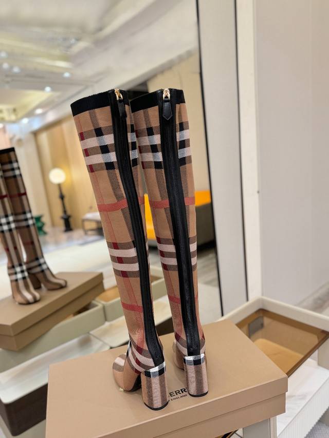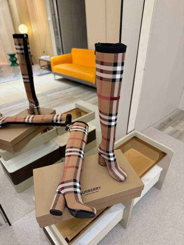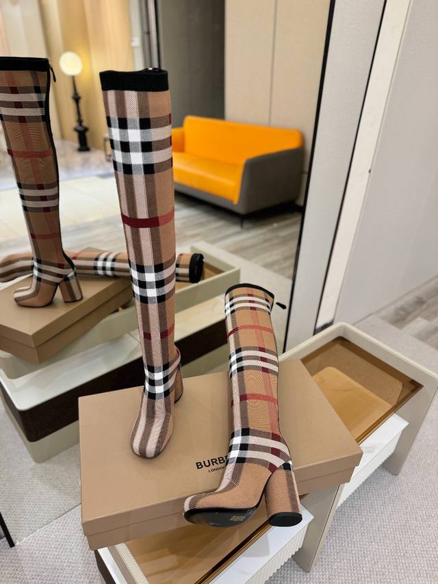 价格p: 独家推出圆头粗跟格纹弹力针织袜长靴 Burberry博柏利英国奢侈品牌,典藏米色,原版1:1复制,贴身弹力针织式及膝靴,设计圆形靴头粗跟,装饰品牌标志