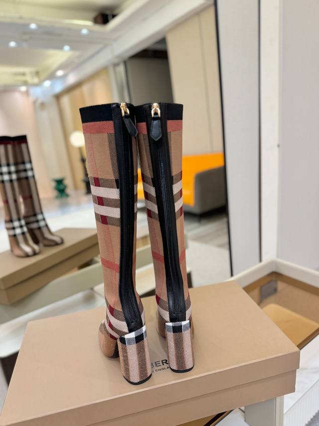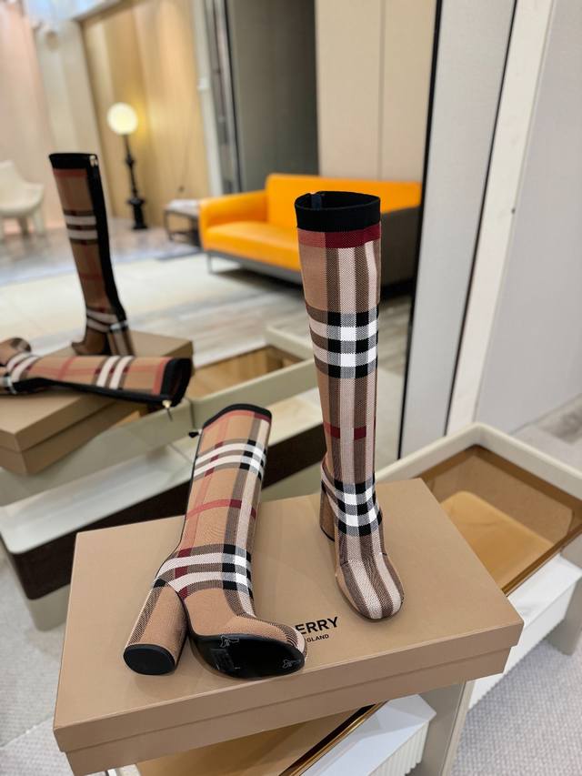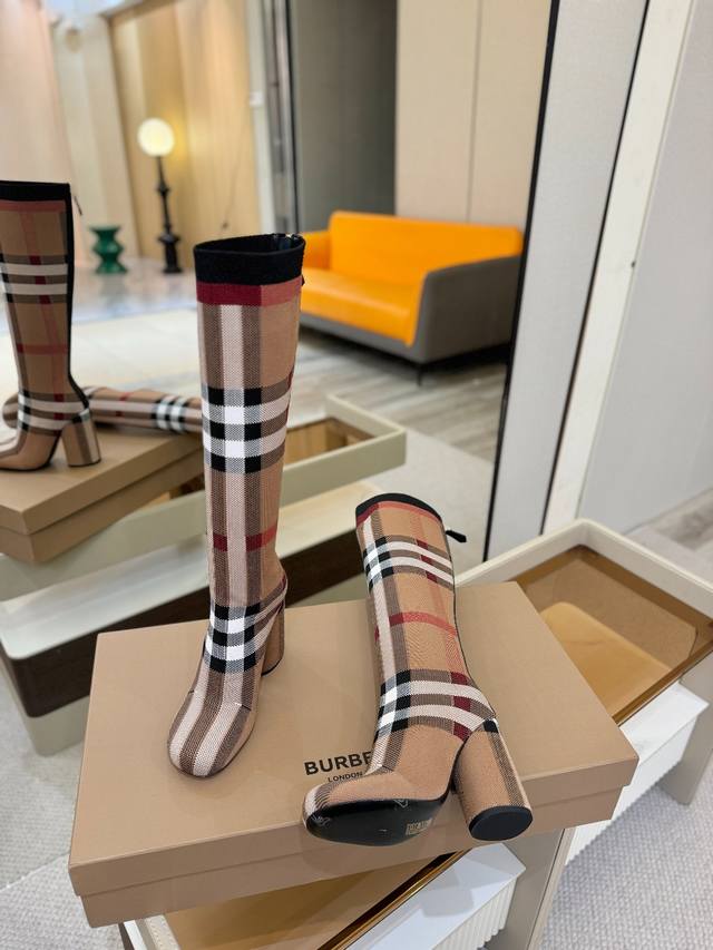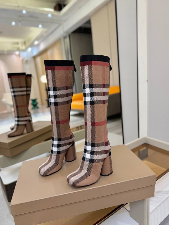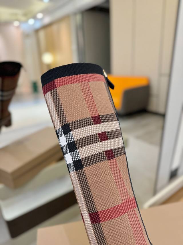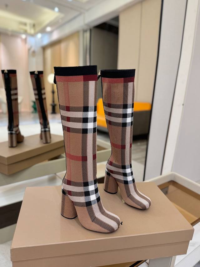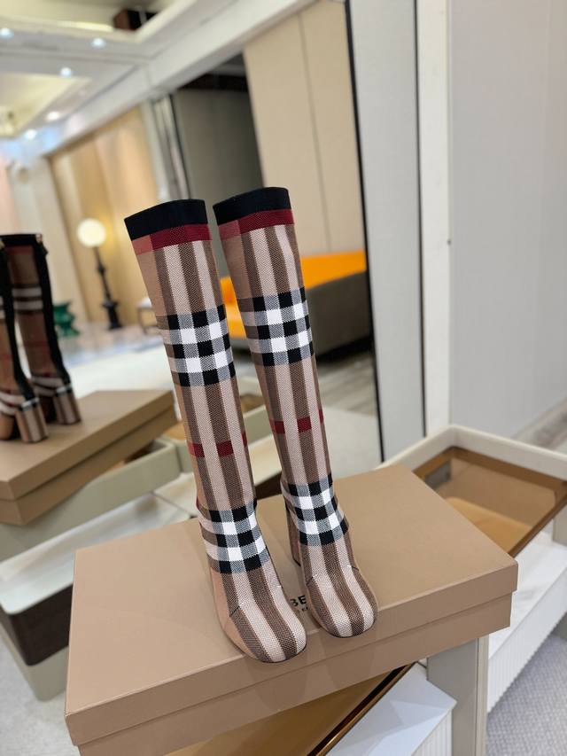 价格p: 独家推出圆头粗跟格纹弹力针织袜长靴 Burberry博柏利英国奢侈品牌,典藏米色,原版1:1复制,贴身弹力针织式及膝靴,设计圆形靴头粗跟,装饰品牌标志