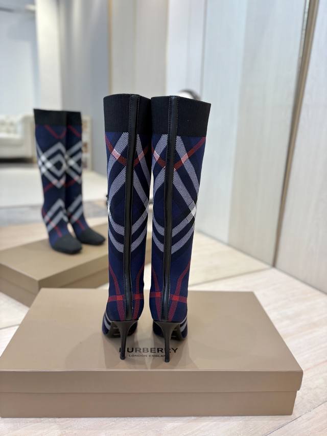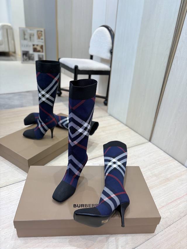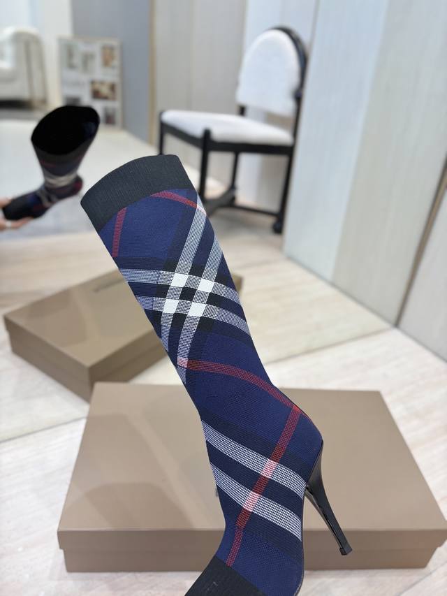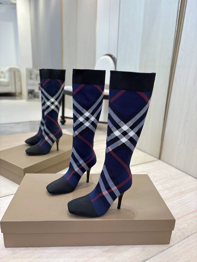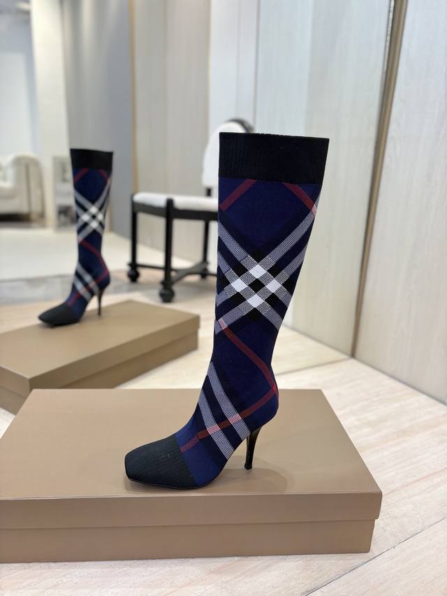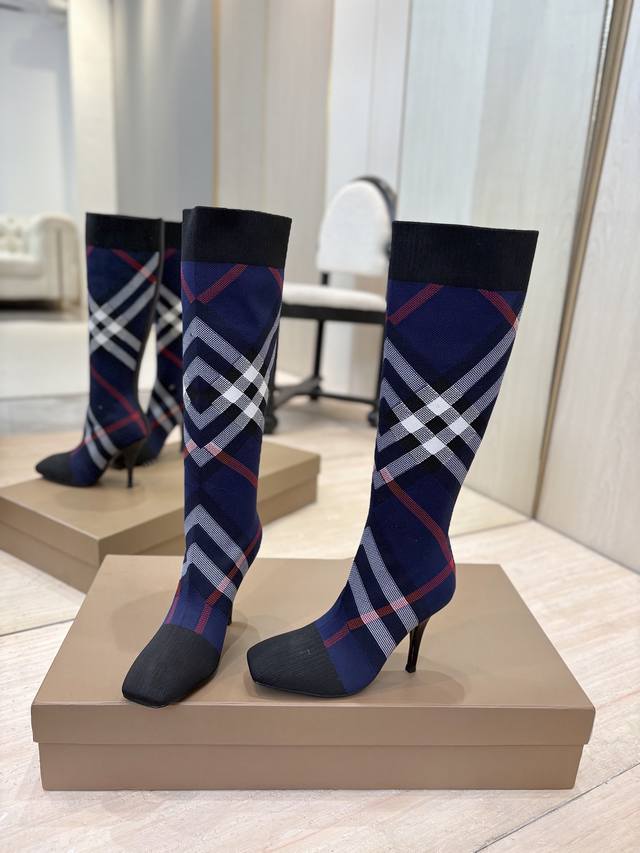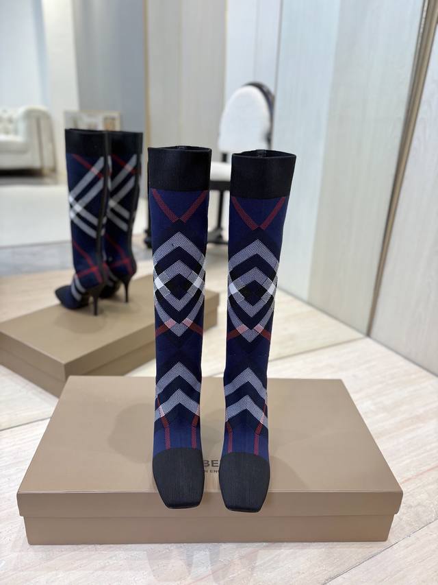 / 出厂价p 博柏利 独家 推出方头细跟格纹弹力针织袜长靴 Burberry博柏利英国奢侈品牌,典藏米色,原版1:1复制,贴身弹力针织式及膝靴,设计圆形靴头粗跟,装