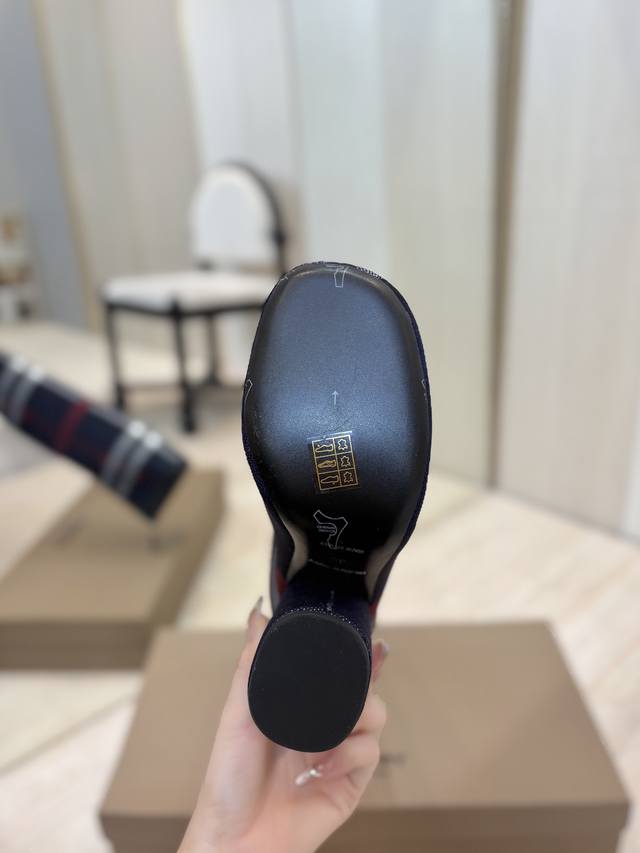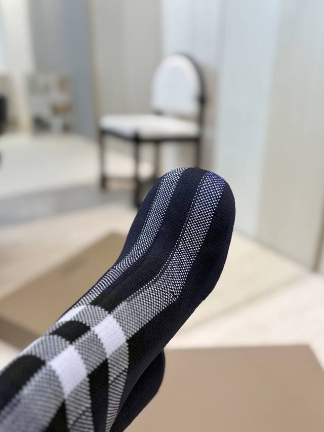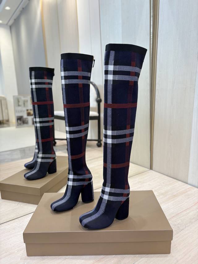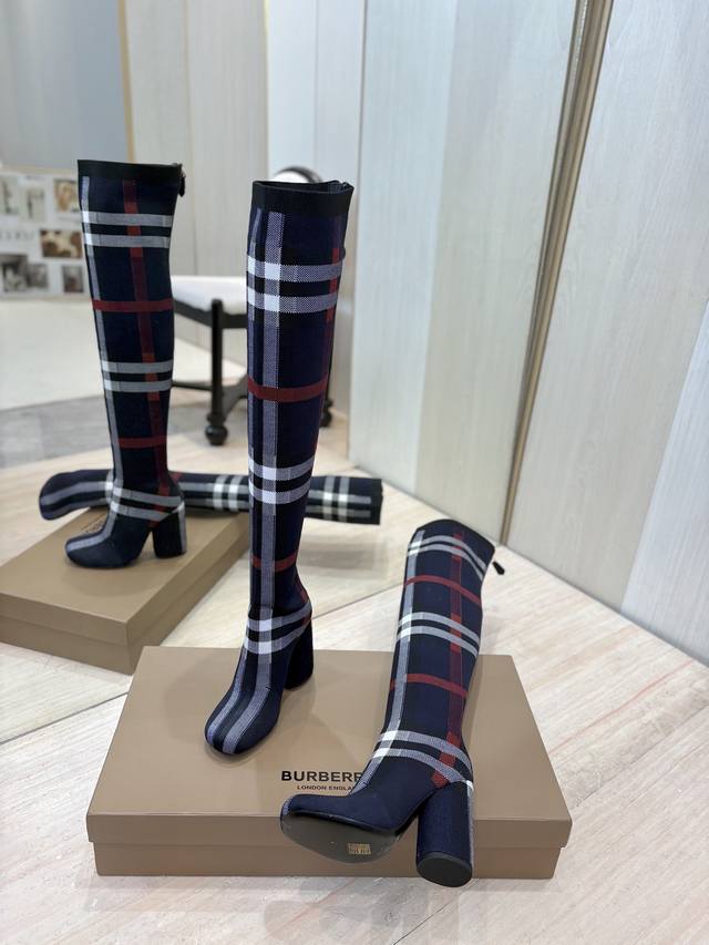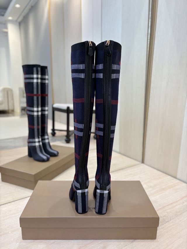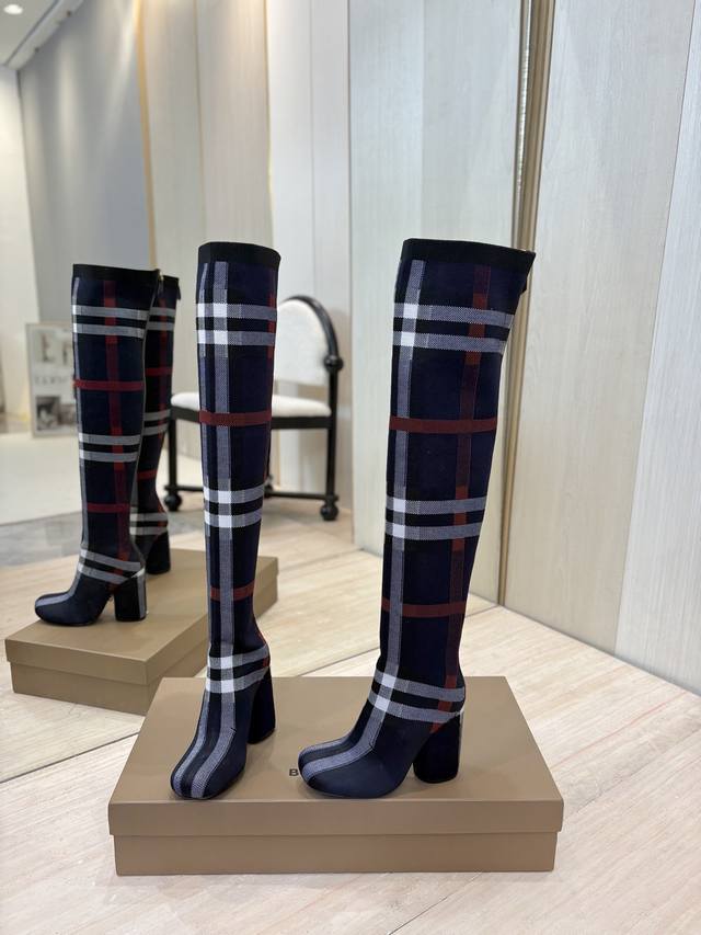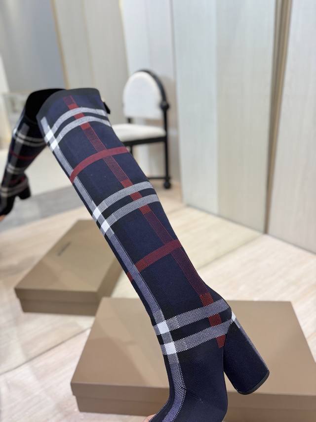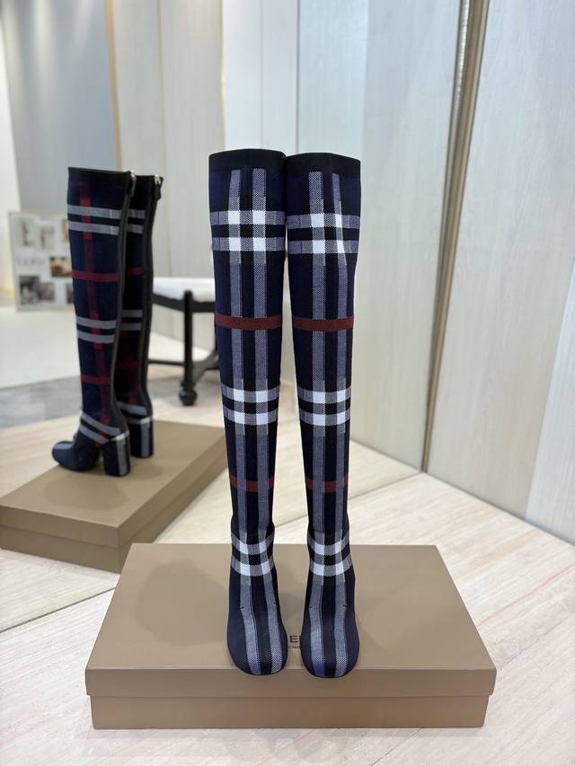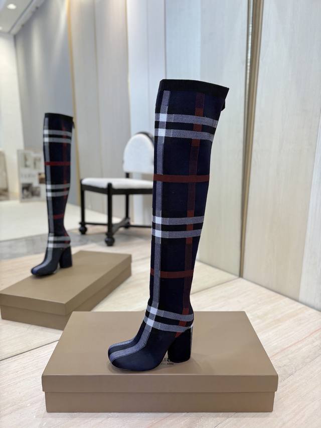 / 出厂价P 独家推出圆头粗跟格纹弹力针织袜长靴 Burberry博柏利英国奢侈品牌,典藏米色,原版1:1复制,贴身弹力针织式及膝靴,设计圆形靴头粗跟,装饰品牌标志