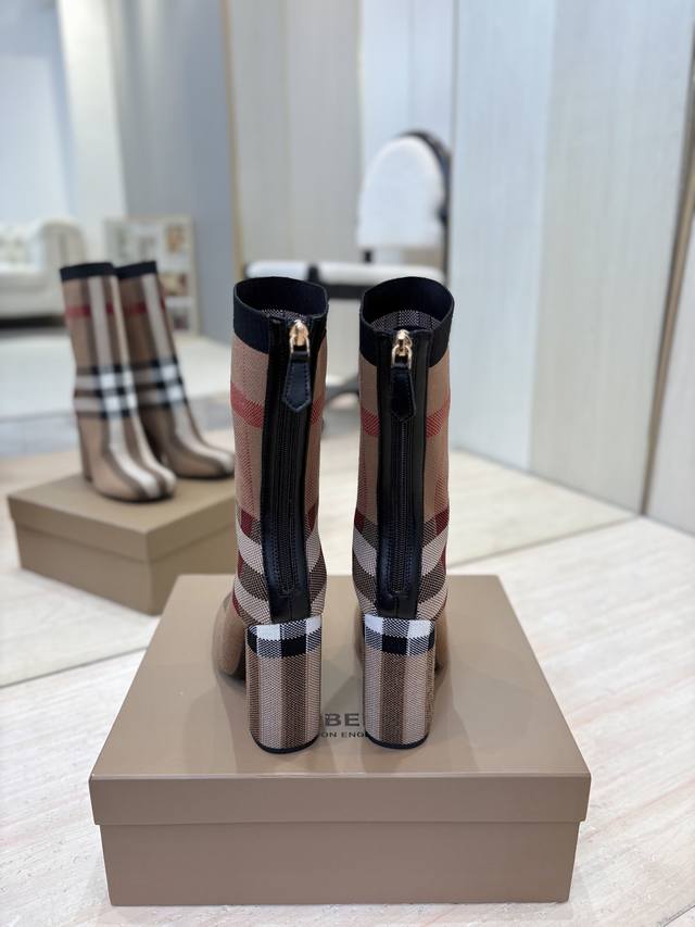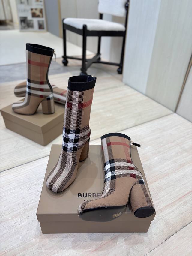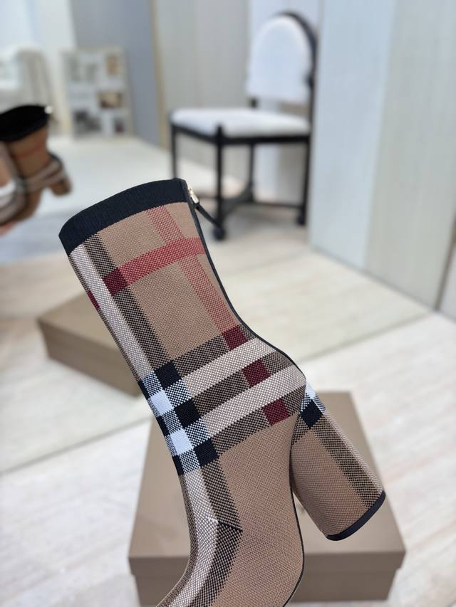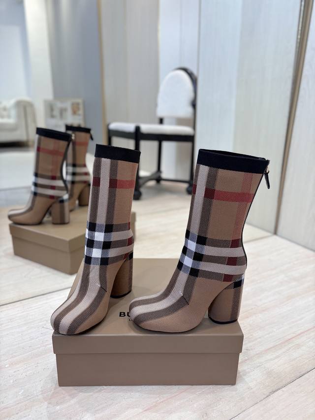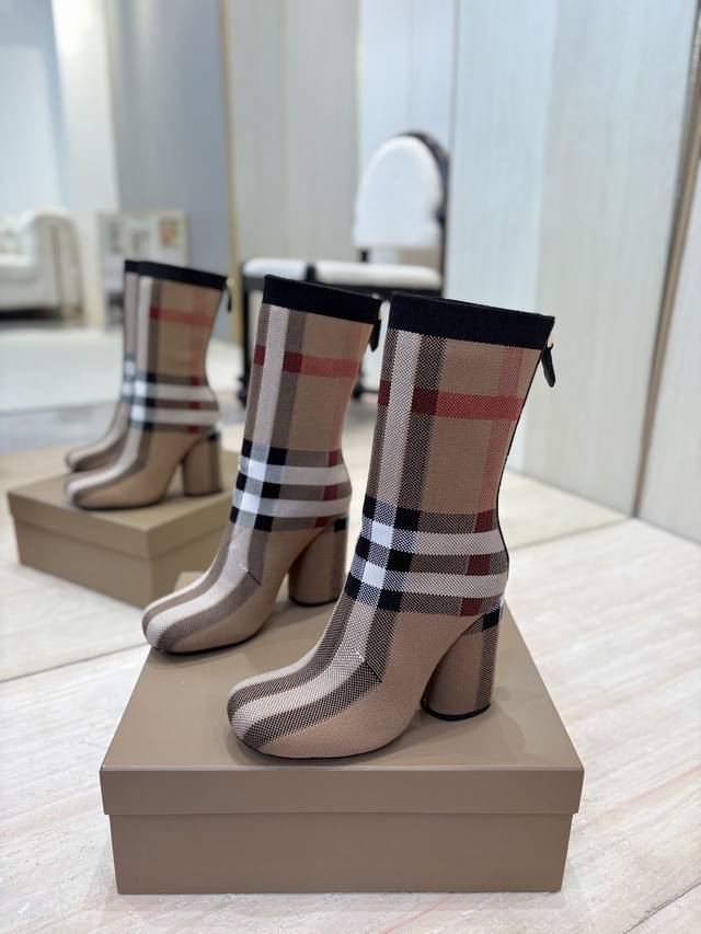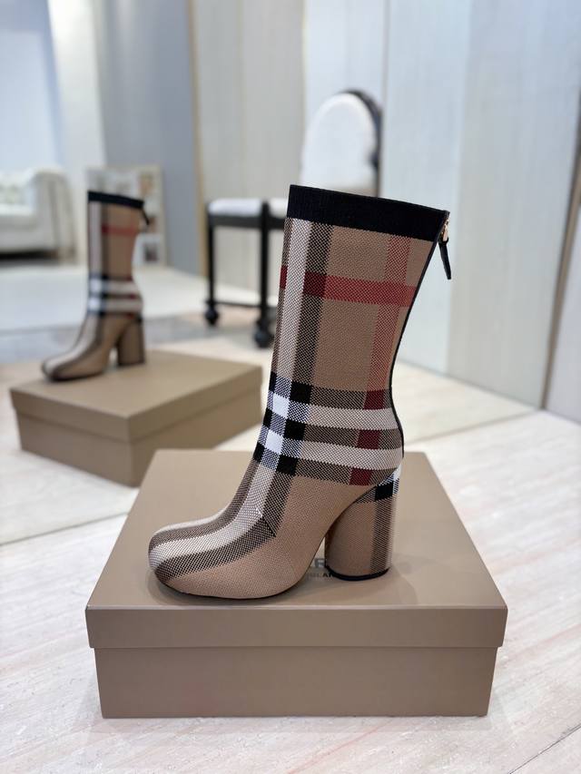 出厂价p 独家推出圆头粗跟格纹弹力针织袜长靴 Burberry博柏利英国奢侈品牌,典藏米色,原版1:1复制,贴身弹力针织式及膝靴,设计圆形靴头粗跟,装饰品牌标志