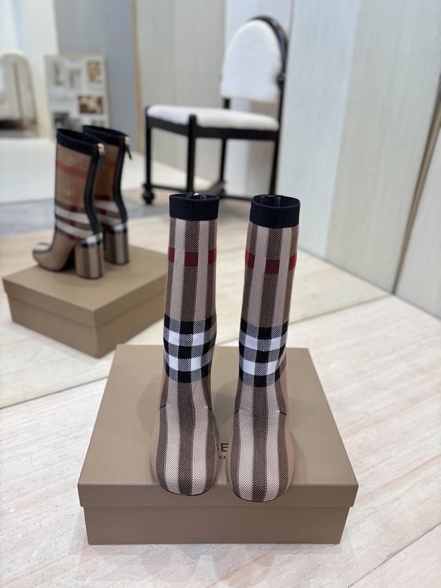 / 出厂价p 独家推出圆头粗跟格纹弹力针织袜长靴 Burberry博柏利英国奢侈品牌,典藏米色,原版1:1复制,贴身弹力针织式及膝靴,设计圆形靴头粗跟,装饰品牌标志