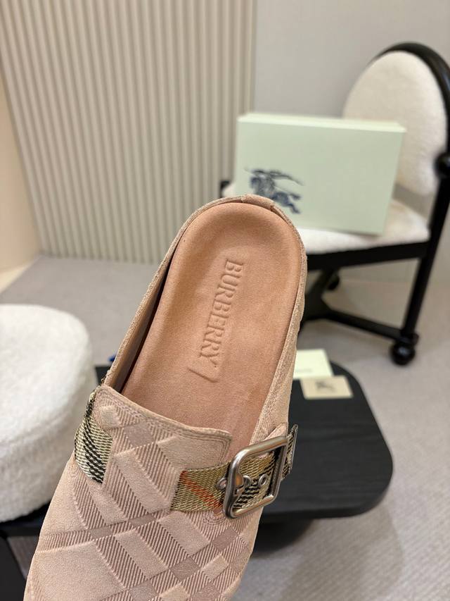 压纹男款 ,女款330元! Burberry2025 爆款勃肯拖鞋出炉,选用柔软反绒面革面料打造,于意大利工坊精制而成。融入格纹图案压花,搭配压纹鞋底,其上点缀