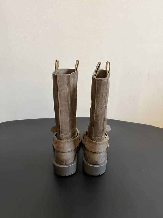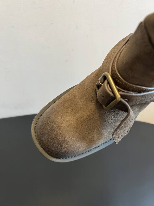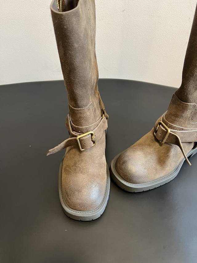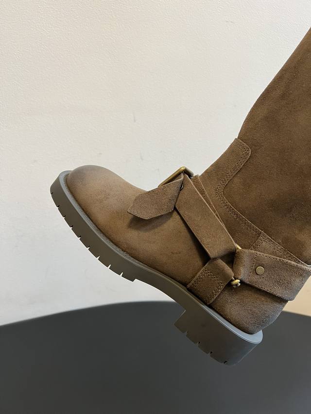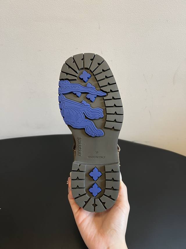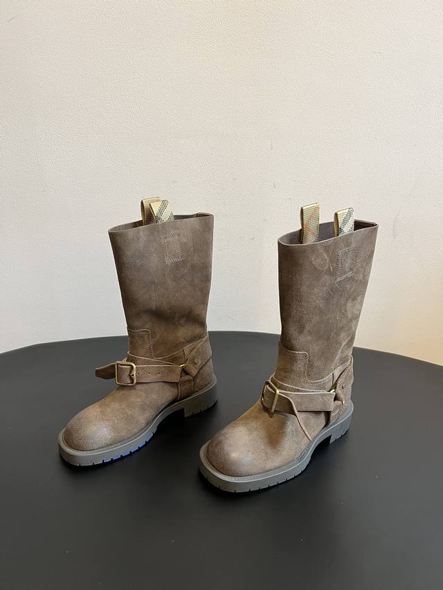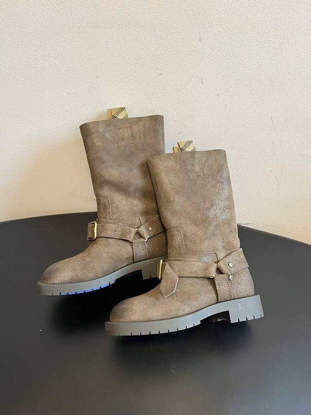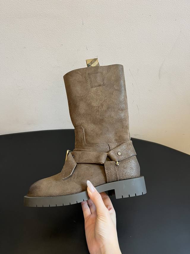 Burberr*25Ss复古厚底英伦风骑士靴中筒靴 DDD 采用小牛皮 磨砂皮两种材质,意大利工坊制作,皮质细腻有高级感。靴口内置Burberry经典格纹提鞋袢,是品牌辨识度很高的元素; DDD 鞋侧有方形缝线装饰,搭配金属扣环束带,扣环刻有品牌标识,呼应马术灵感。中筒靴型+略宽的靴口设计,适配不同腿型;鞋底是厚底橡胶材质,既增高又防滑耐磨,兼顾舒适与风格。 DDD 材质:牛皮 DDD 内里:牛皮 DDD 大底:橡胶大底 DDD 增高:3.5Cm DDD Size:35-40码 40码定制不退换 DDD