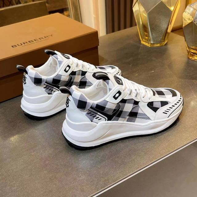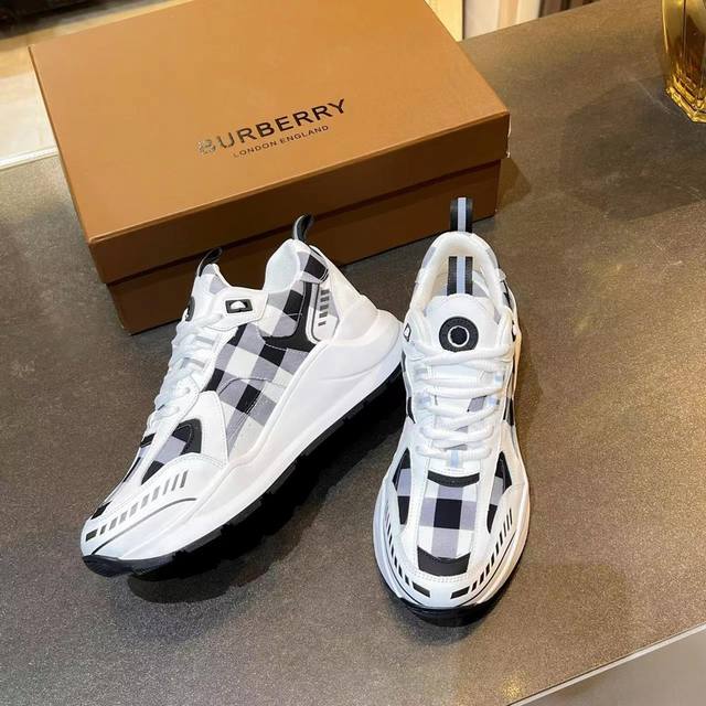 专柜最新高端版本,专柜一比一,巴宝莉23秋冬最新厚底运动鞋,采用复古格子、麂皮和皮革制成,搭配突出的弧形鞋底,鞋面:48%棉,52%小牛皮,衬里:60%聚酯纤维