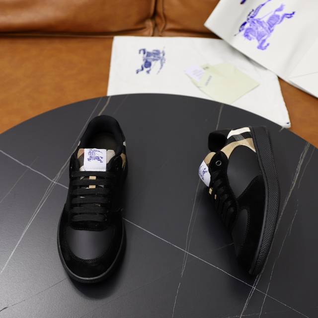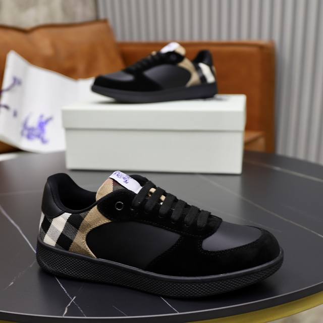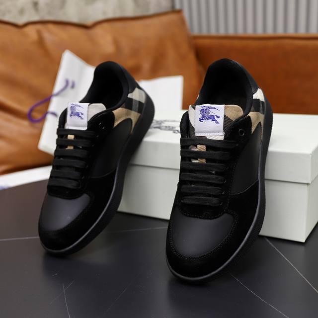 出厂价Pp: 顶级原单情侣款B家巴宝莉2025Ss男士经典低帮运动鞋,头层牛皮打造,装饰焕新的品牌徽标。头层牛皮垫脚,鞋跟饰有 Burberry 字母压花徽标,Tpu原版轻便耐磨大底! Size:39–44 38、45.46定做