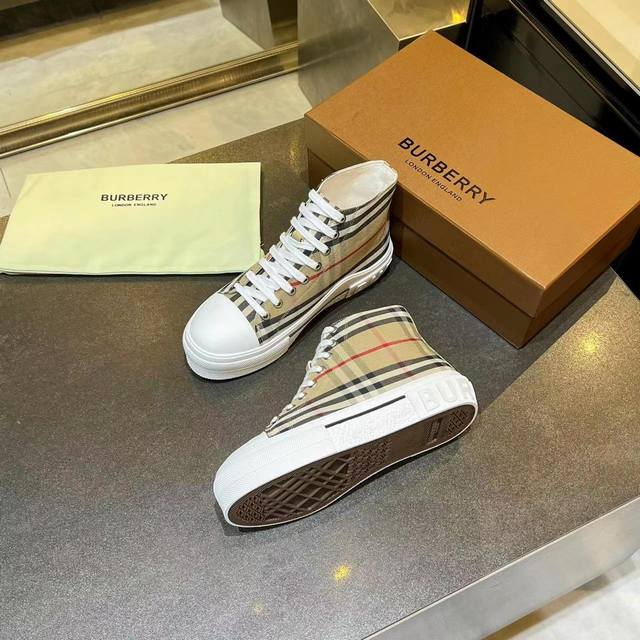 实价: 高帮专柜新增颜色,巴宝莉复古格子棉质运动鞋,原板5D打印,印有对比鲜明的全新标志,面原板格子布,内里100%羊皮,女款码数35-40 男款39-45,