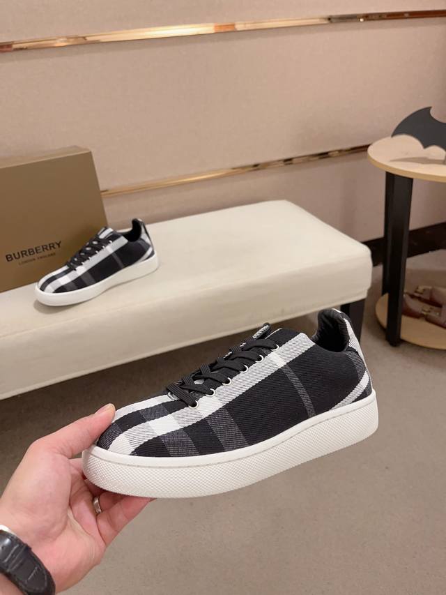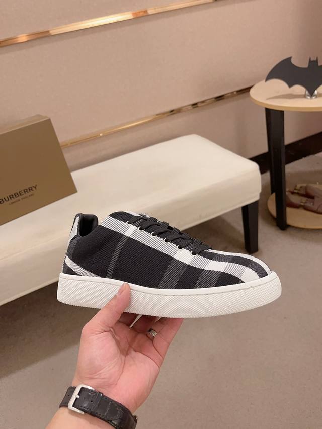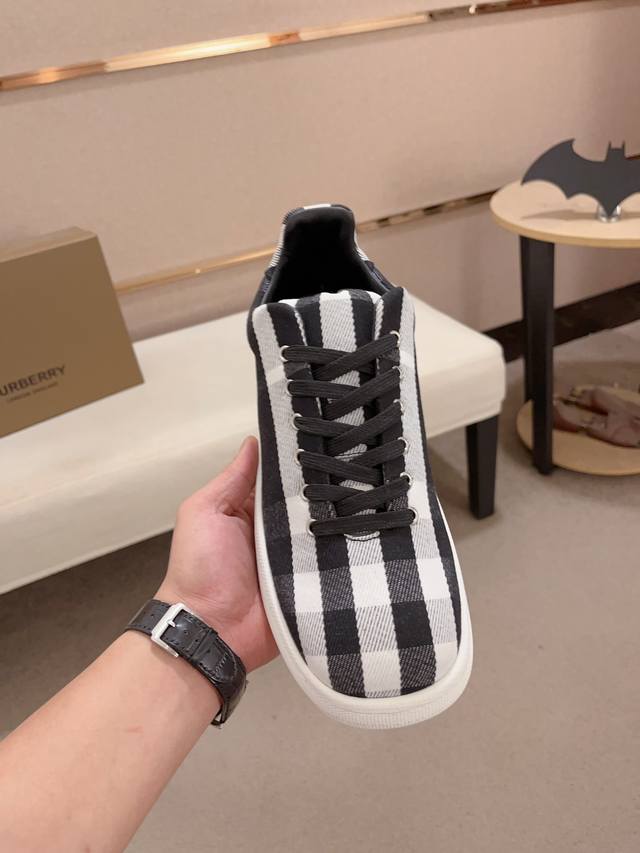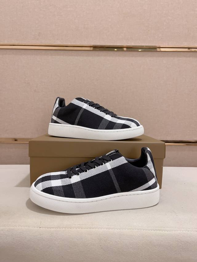 工厂价 新款巴宝莉家男士经典低帮运动鞋,以 Vintage 复古格纹棉材质搭配小牛皮焕新演绎,装饰焕新的品牌徽标。头层羊皮内里,鞋跟饰有 Burberry 字母压花徽标,Tpu原版大底!码数:38-44。可定做45