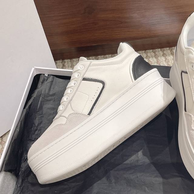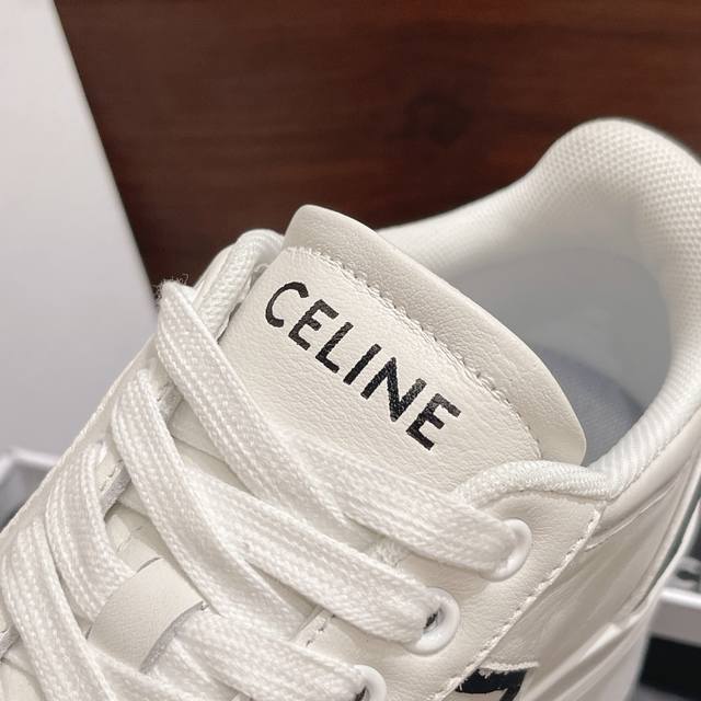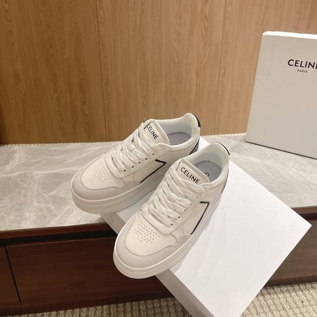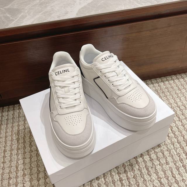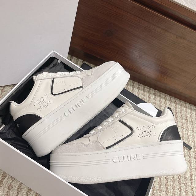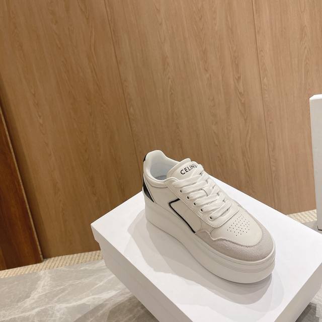 代购版本 !Celine 赛琳 春夏款新色拼皮凯旋门Logo松糕厚底小白鞋!