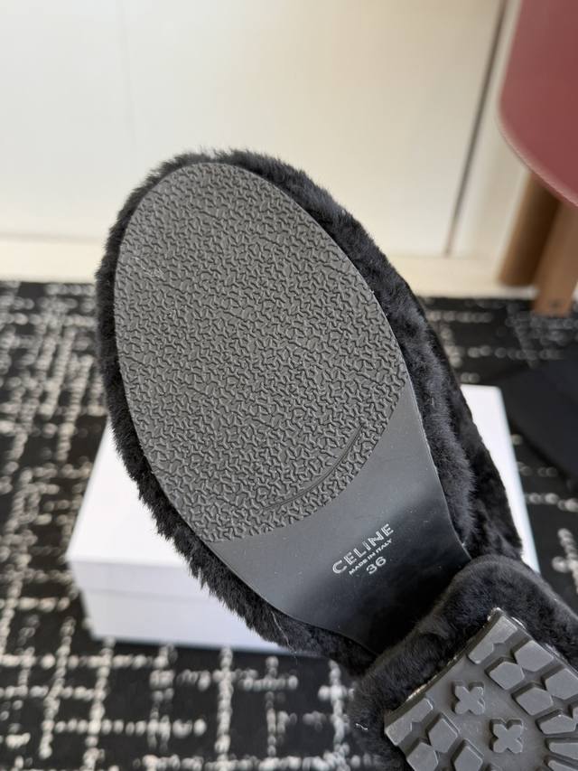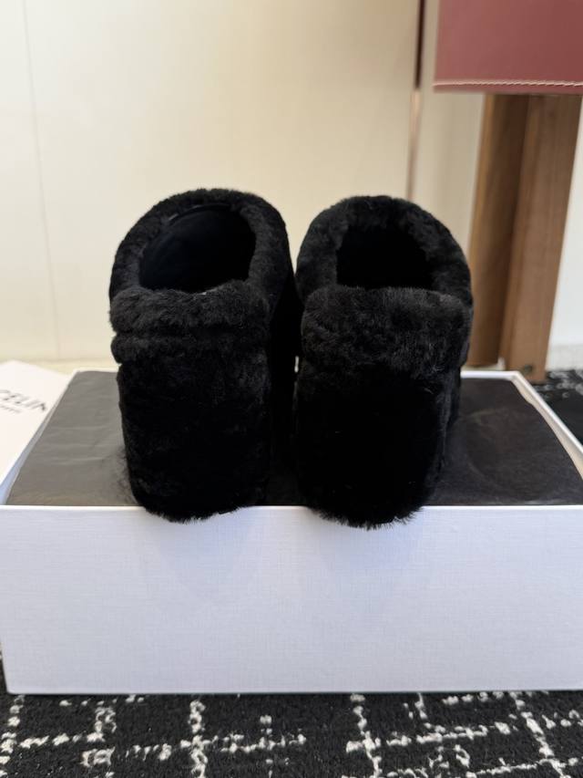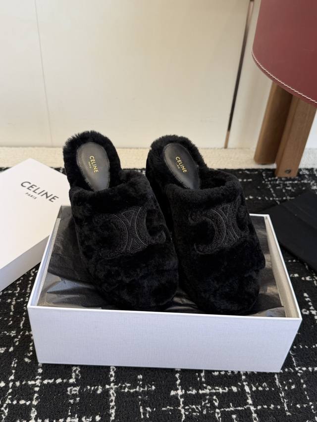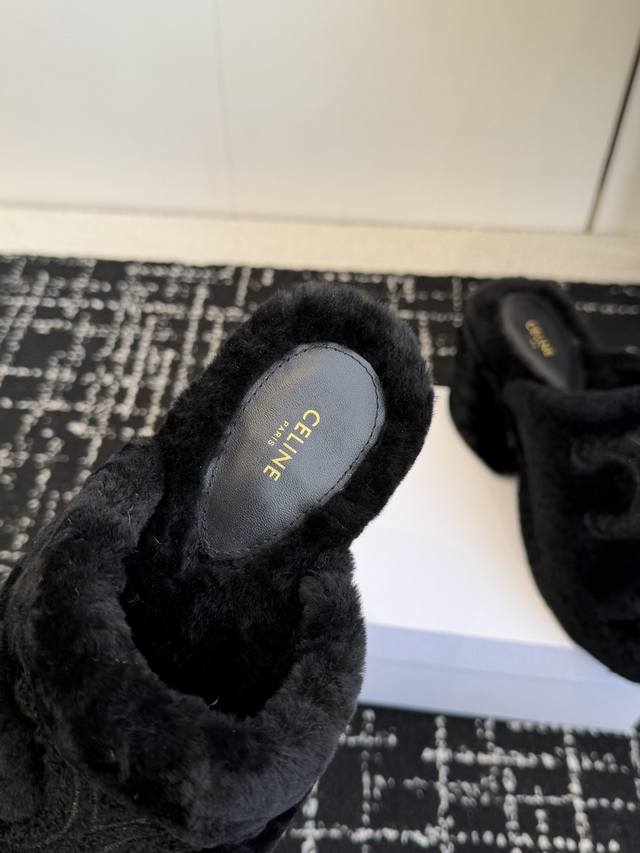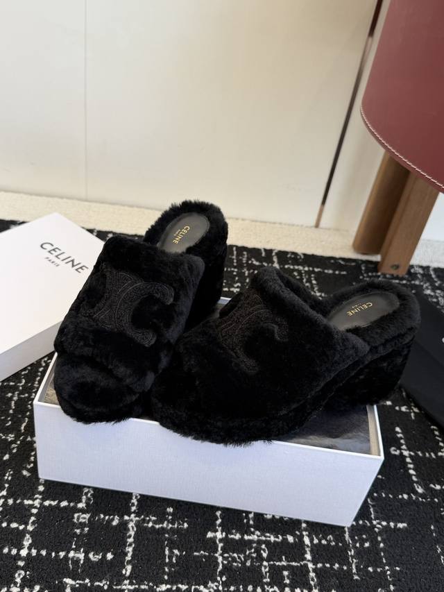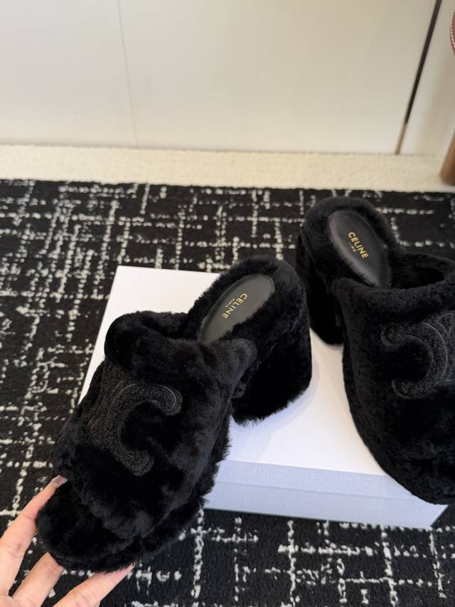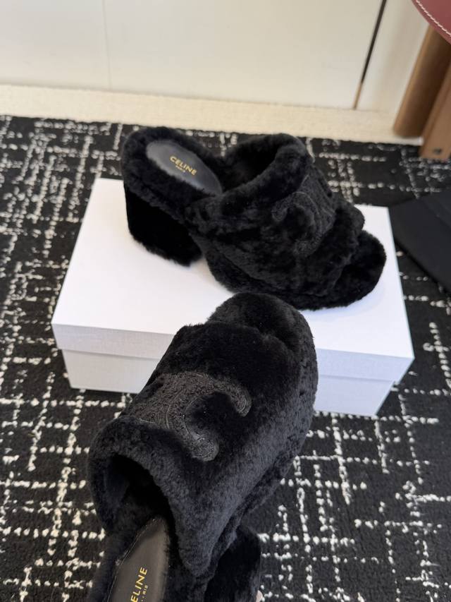 代购级 Celine 塞琳25Wf大凯旋门防水台高跟毛拖 踏入C家毛拖的世界 邂逅一场舒适与奢华的邂逅。 它以独特设计 将品牌经典与时尚前沿巧妙融合。标志性的大