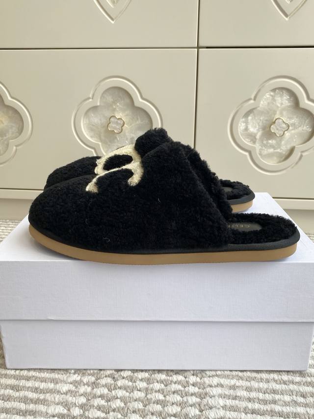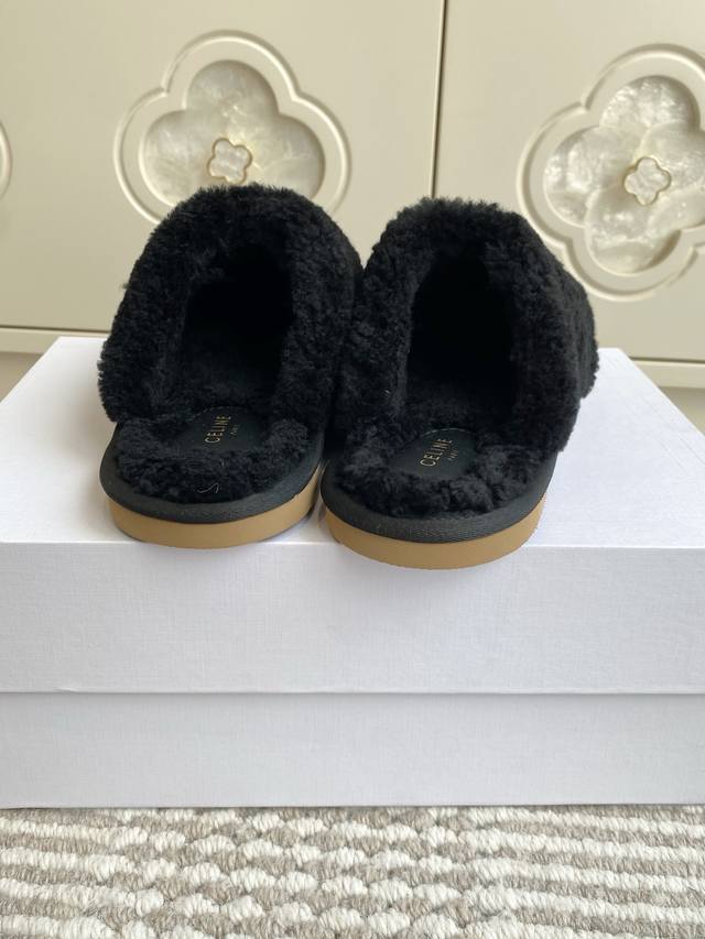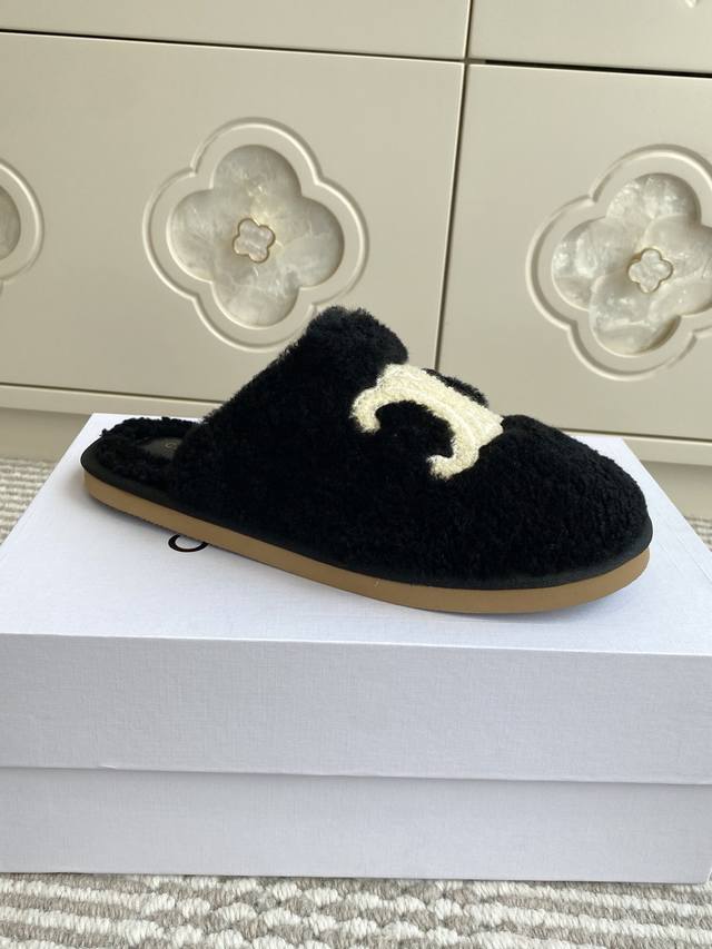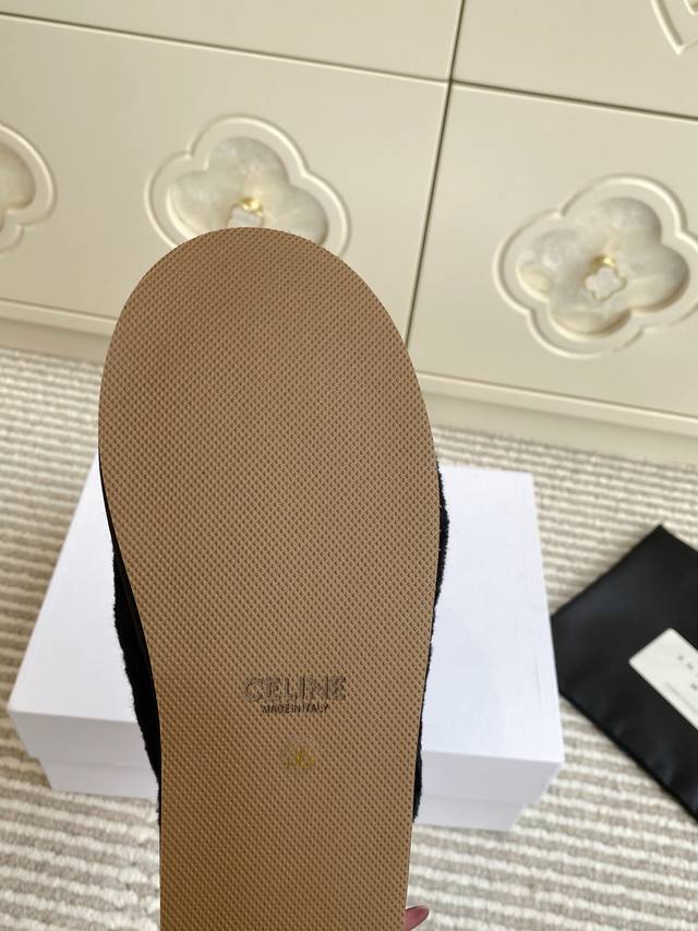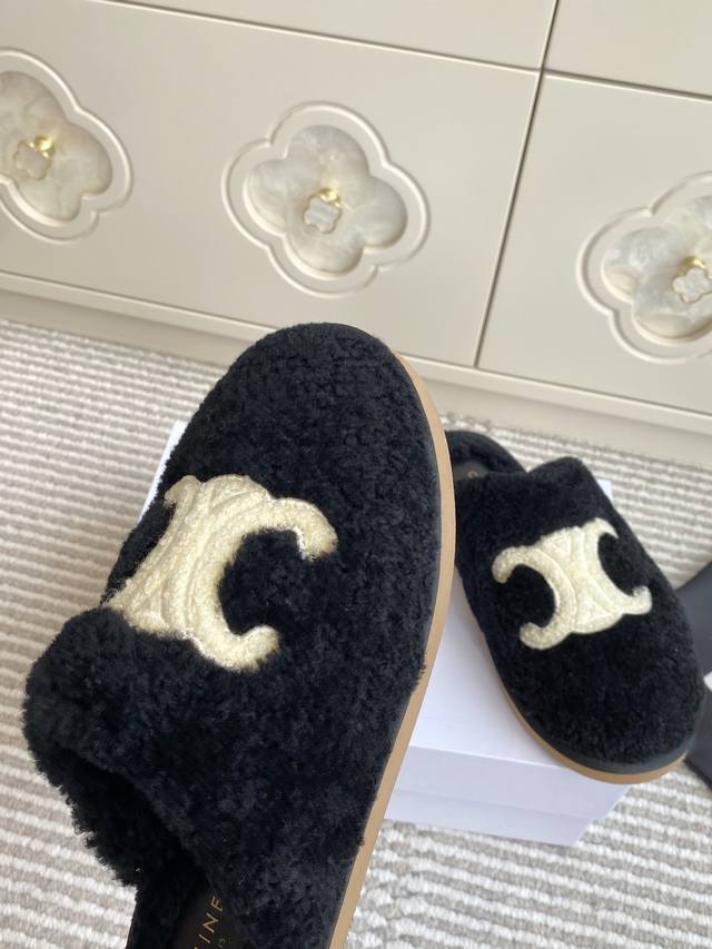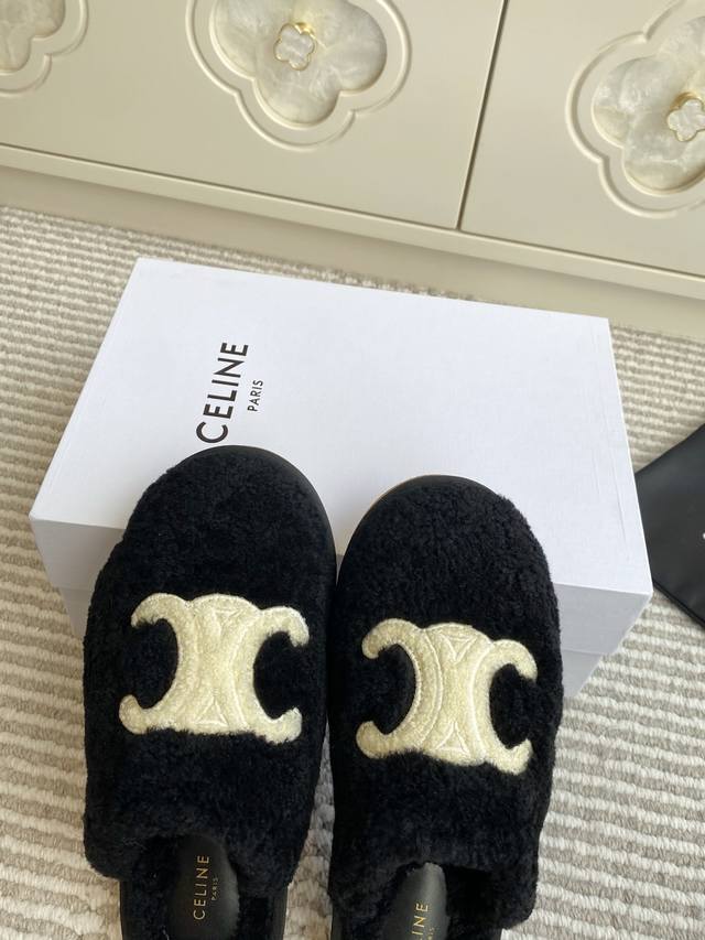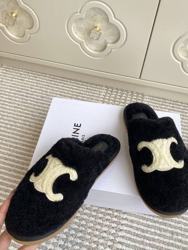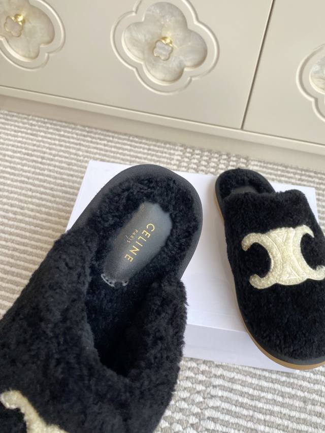 代购级Celine赛琳 新款凯旋门包头穆勒拖鞋 厚底毛毛鞋