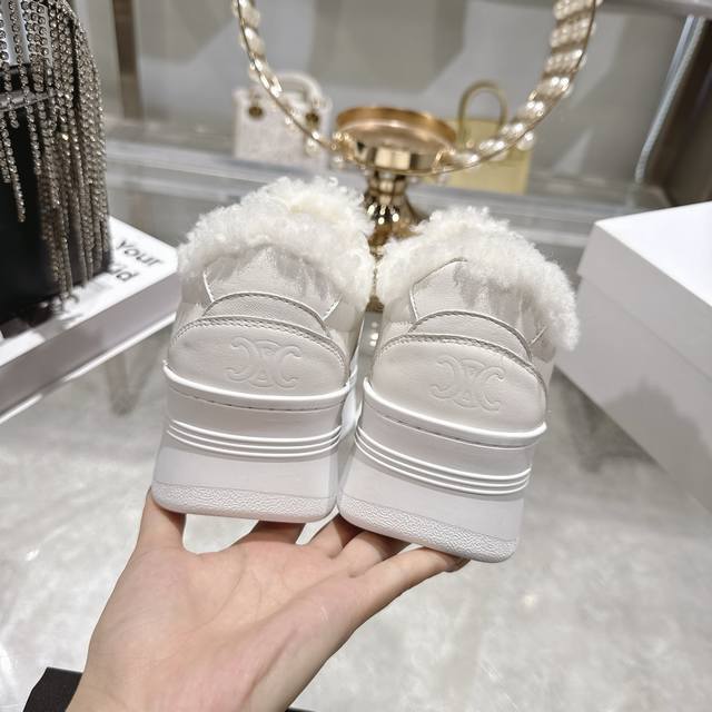出厂 高版本 Celine*思琳赛琳 2025Ss新款徽标系带厚底羊毛里休闲鞋小白鞋 简单舒服,干净利落,增高显腿细,无论是单穿还是搭配阔腿裤,高街又复古一起来