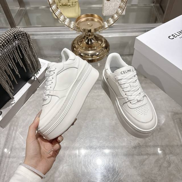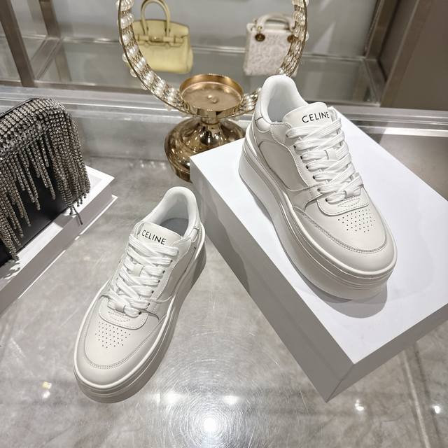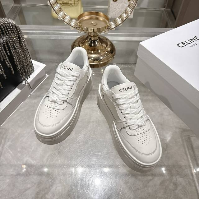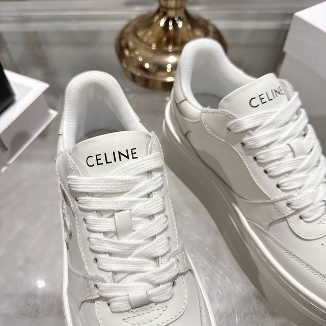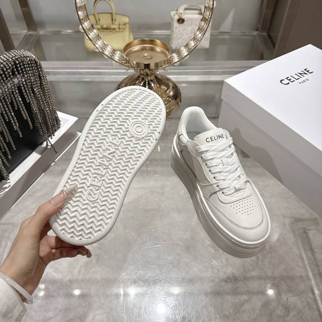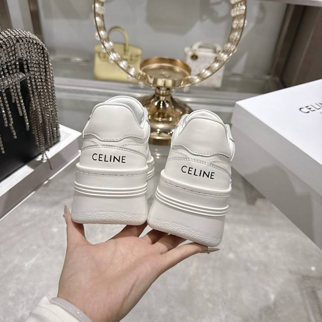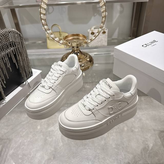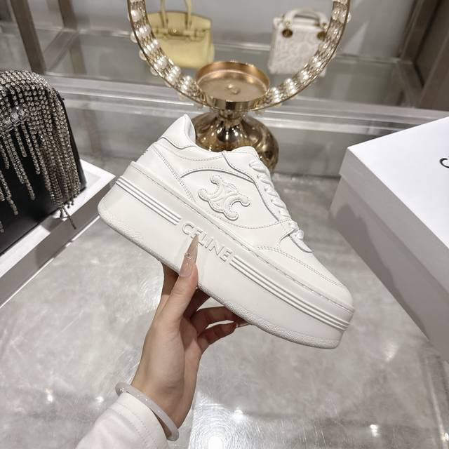 / 出厂 .26年春季新款Celine赛琳 Block Triomphe 运动鞋 Block Triomphe牛皮革坡跟运动鞋厚底小白鞋 鞋后帮和侧面压印Celin