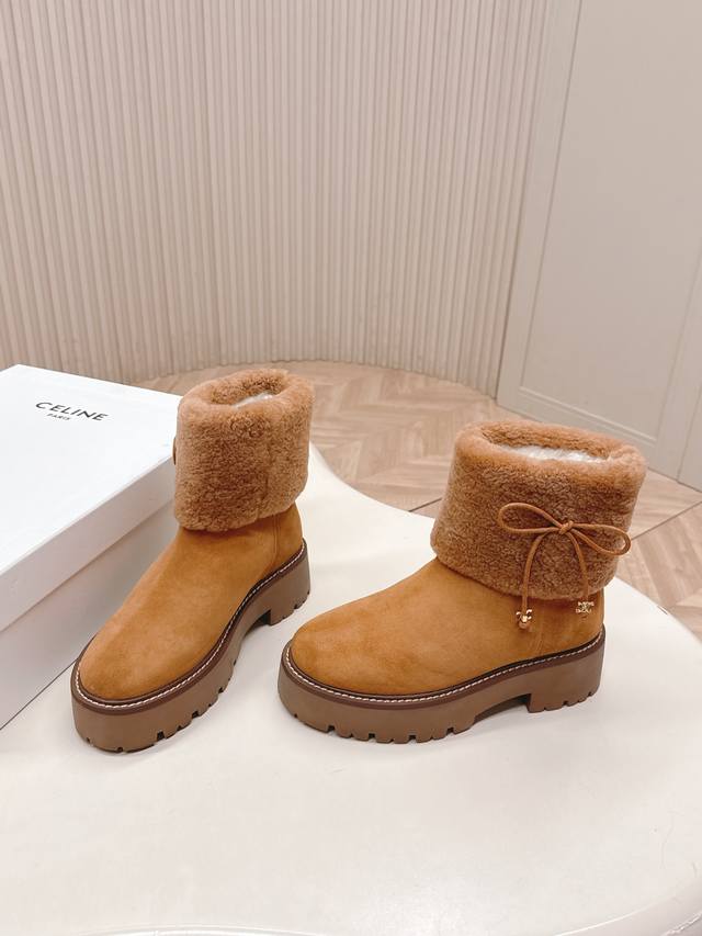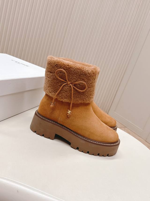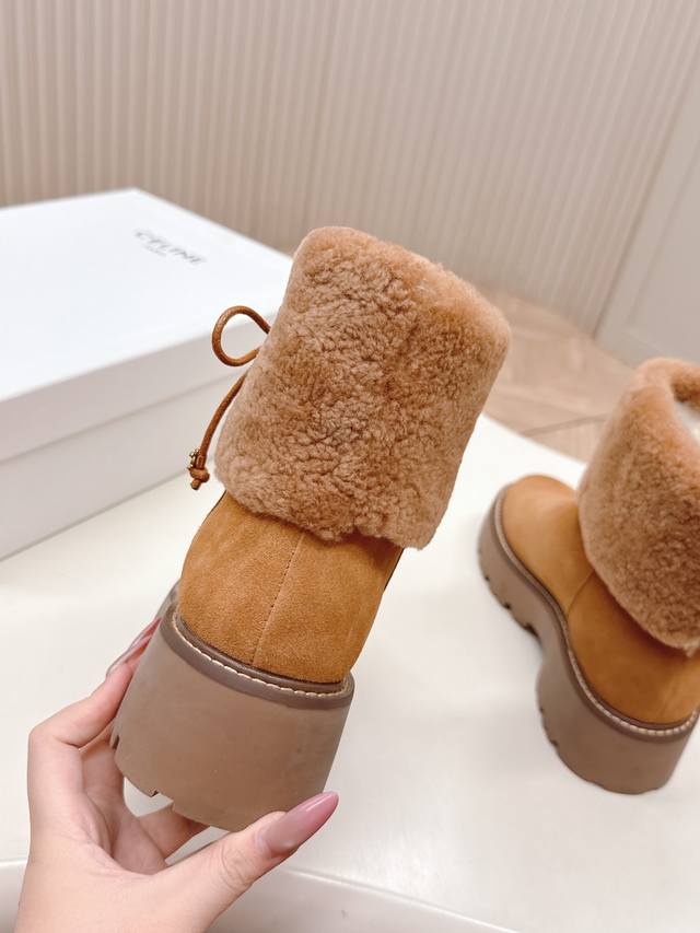 出 Celine 思琳新款 经典凯旋门羊毛靴雪地靴厚底短靴 超级显气质增高显瘦款 冬日女王的绝佳搭配!全羊毛保暖简约时尚又俏皮 靴筒全羊毛更显贵气优雅 鞋面:牛