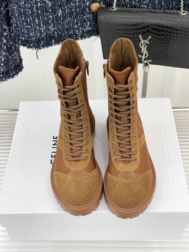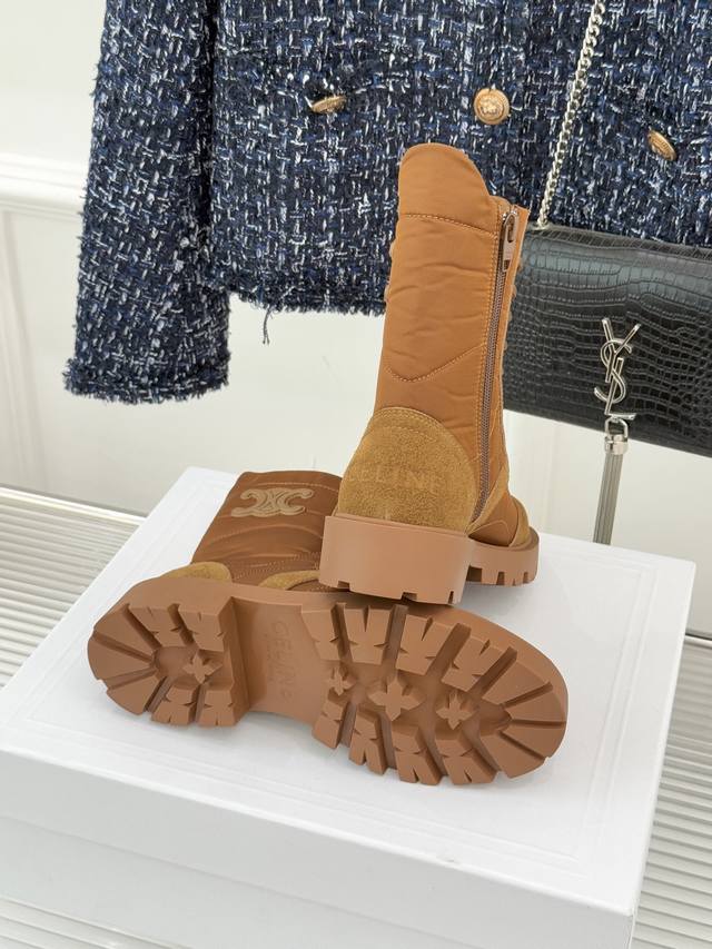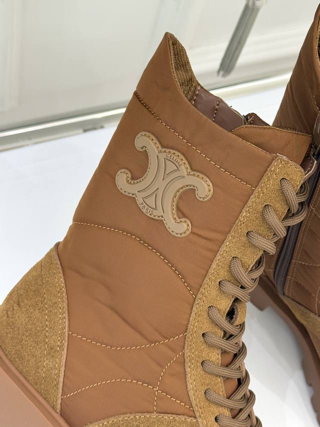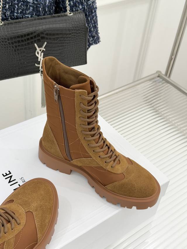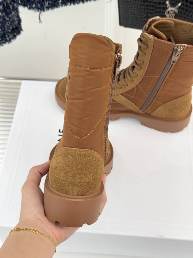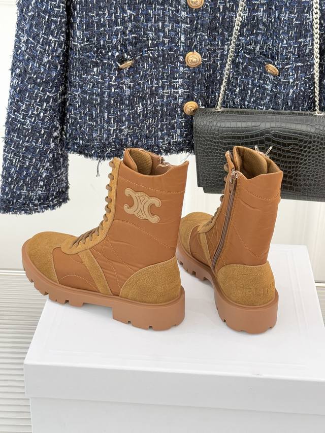 厂价 Celine 塞琳25Wf新品凯旋门 复古厚底马丁靴短靴 当英伦硬朗邂逅巴黎优雅 这双马丁靴以复古之形 写就当代格调。 侧面Triomphe皮标浮雕如时光印记 将品牌底蕴凝于方寸之间。 厚底橡胶大底兼具稳健与增高力 经典系带设计穿梭复古脉络 皮革衬里与软垫鞋领碰撞出舒适触感 打破硬靴的刻板印象。 无论是搭配条纹羊毛开衫演绎慵懒法式 还是与皮革单品碰撞酷帅锋芒 亦或混搭连衣裙平衡柔美与硬朗 它都能成为造型核心。 在城市街头与秋日漫步中 以复古姿态续写摩登传奇 让每一步都自带焦点气场。 面料采用原版定制