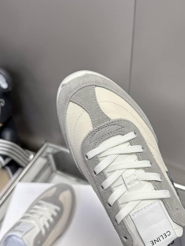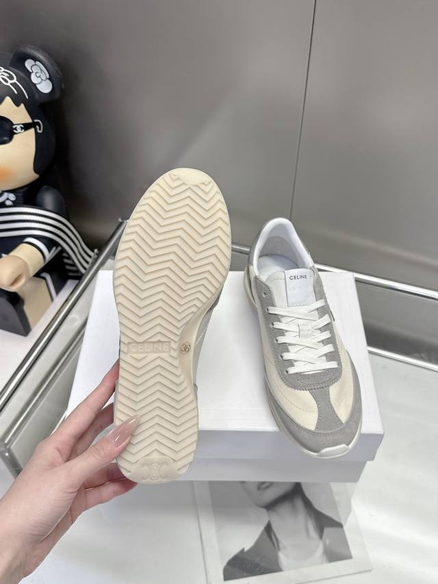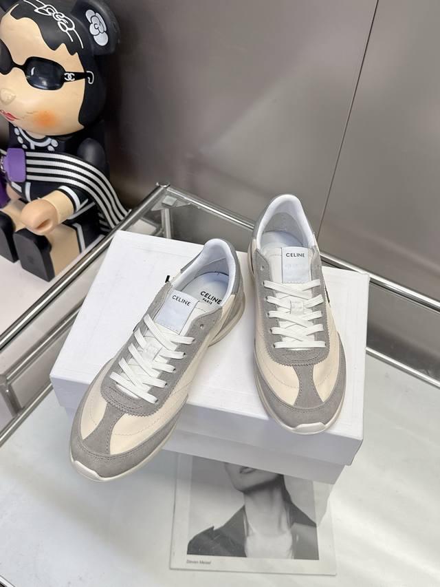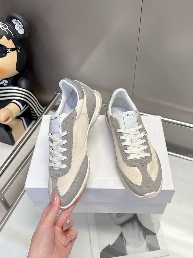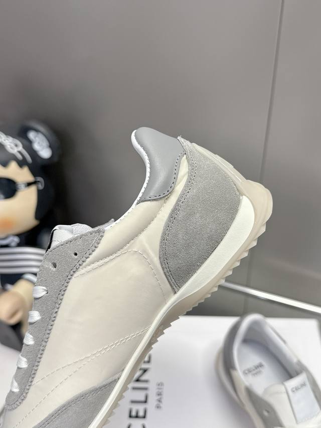 FFF 厂价P: 码数35-40 41定做 DDD Celine Racer女士香草色低帮运动鞋,精致地重新诠释了1970 年代的运动风格,将怀旧魅力与现代优雅融为一体。Racer 作为Celine 鞋履系列的全新成员,以轻盈的鞋型,展现轻松随意的巴黎时尚,带来全天舒适体验。鞋面采用尼龙、绒面小牛皮和光滑小牛皮精制而成,丰富的纹理组合提升了复古跑鞋的设计感。其结构兼顾透气性和结构感,无论是休闲造型还是高级休闲装扮,都能完美契合。标志性的 Triomphe 标志体现了该品牌的精致美学,绣在侧面板上,并压印在