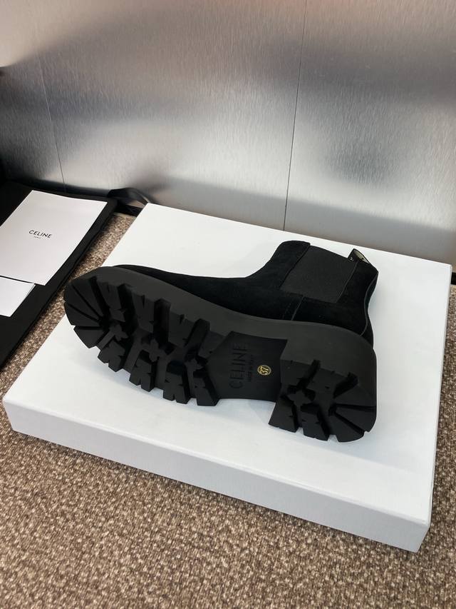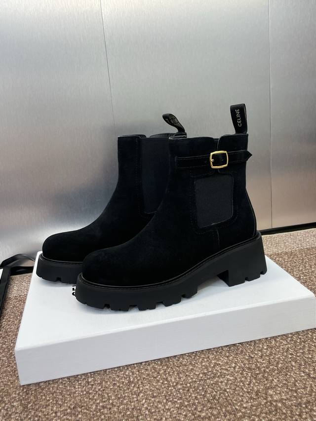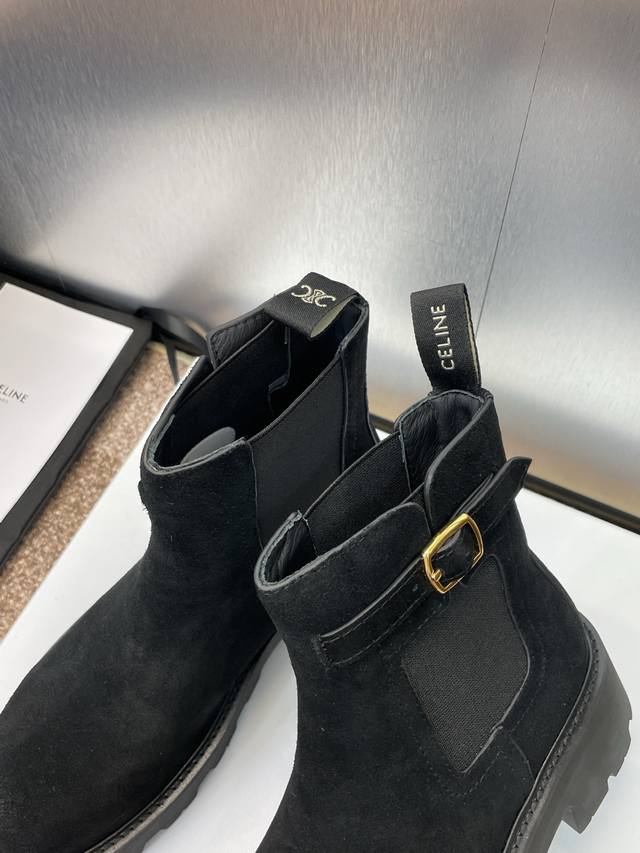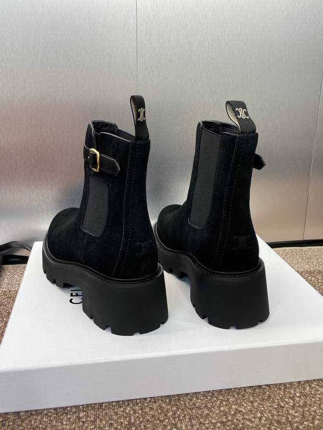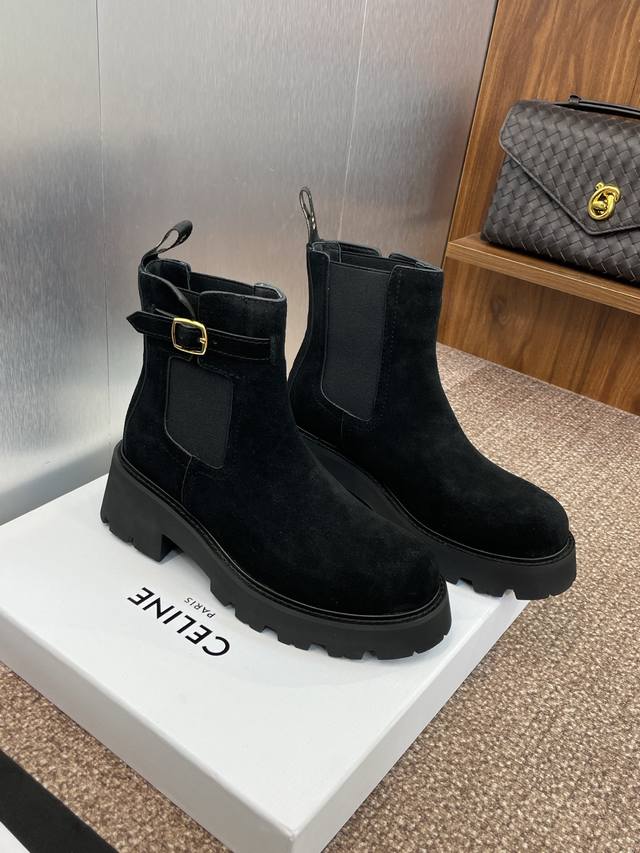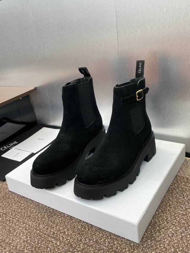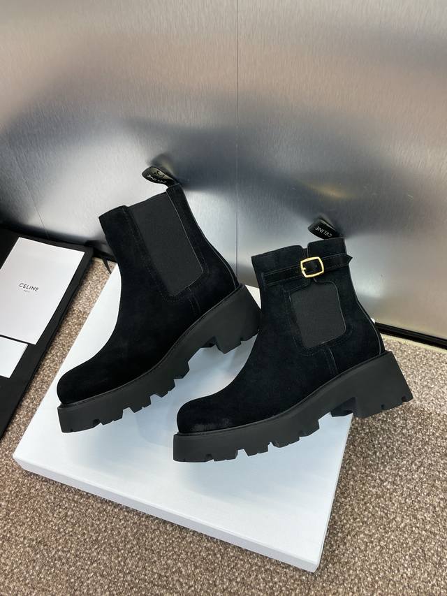 工厂P价P Celine 2025秋冬新款切尔西机车女短靴 瑟琳字母Logo五金扣厚底低跟圆头骑士靴 材质:鞋面定制进口羊猄皮+水染牛皮里+原版开模耐磨绒齿轮大