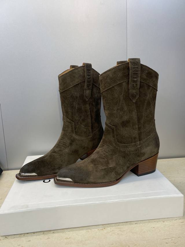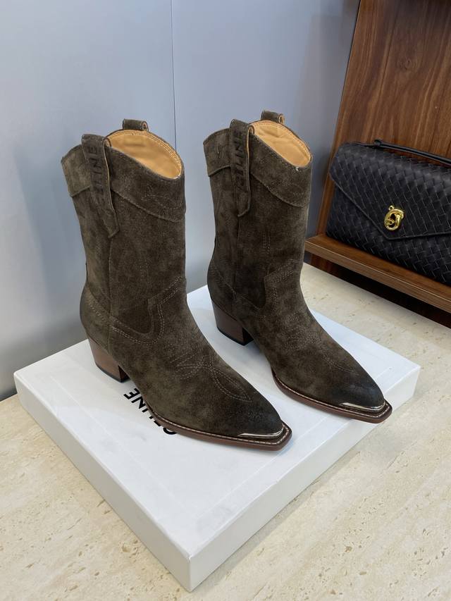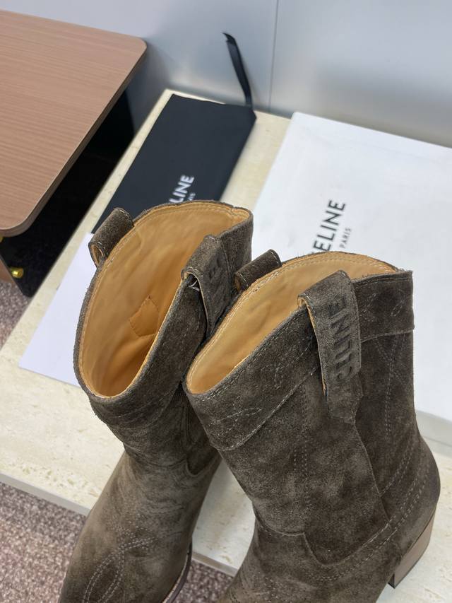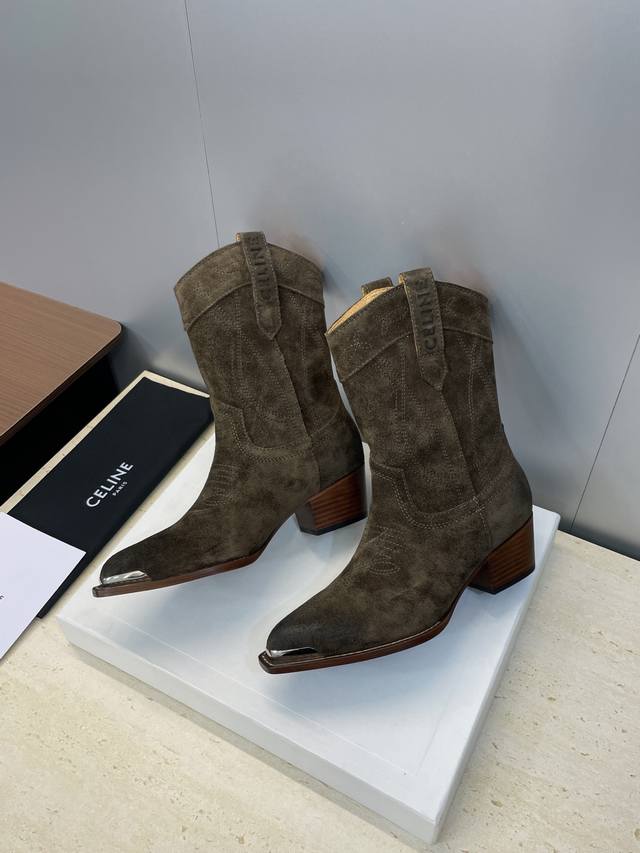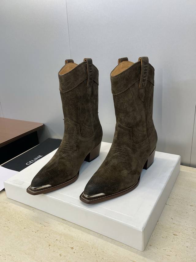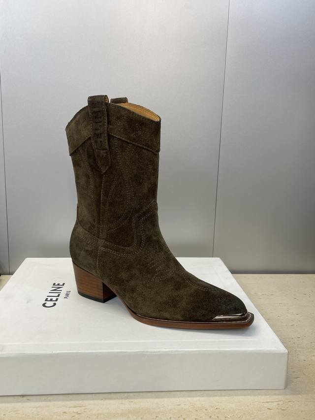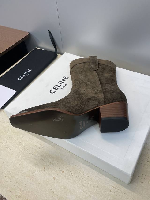/ 工厂P价P Celine 2025秋冬新款朋克风格铁头一脚蹬机车女短靴 瑟琳字母Logo五金扣粗跟尖头骑士靴 材质:鞋面定制进口小牛皮 进口牛猄皮+水染牛皮内里