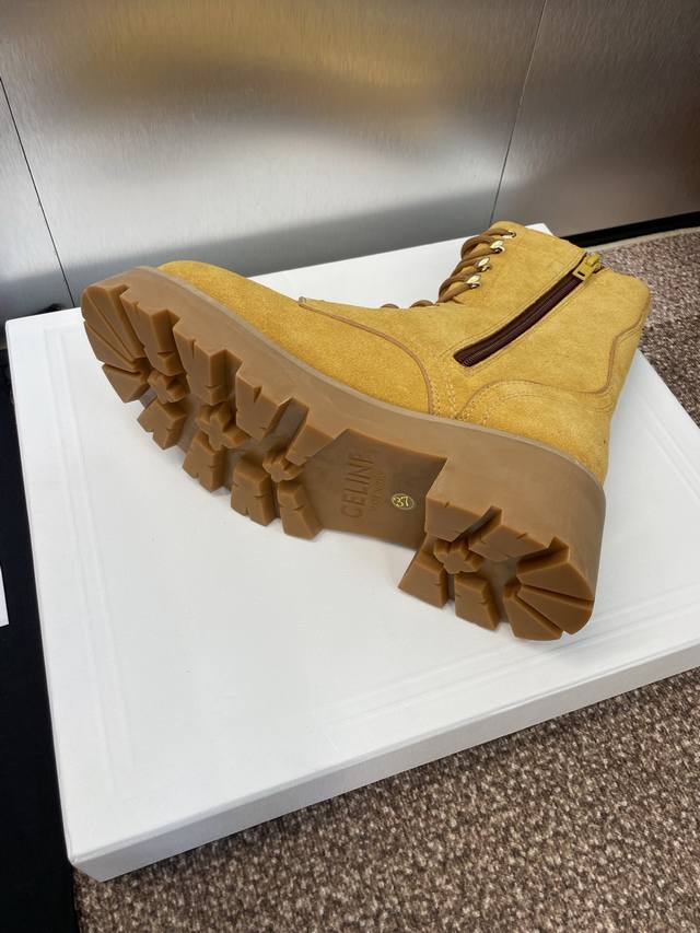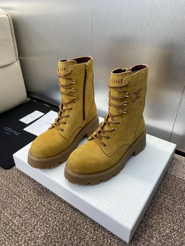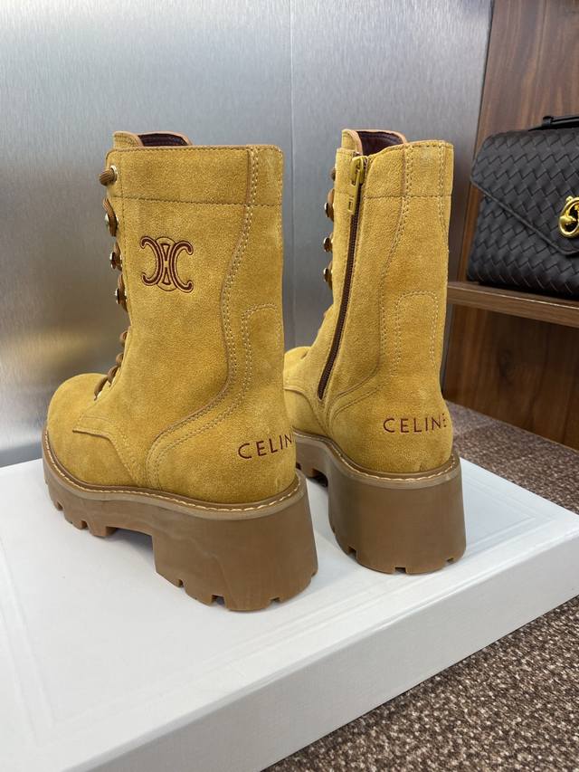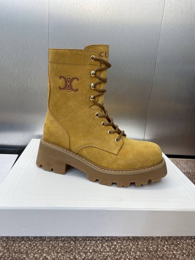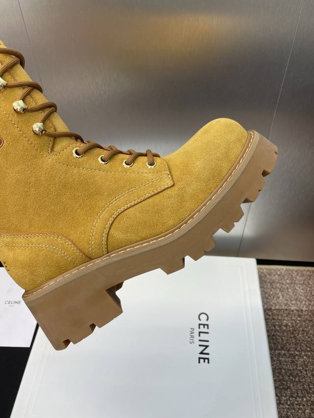 工厂P价P Celine 2025秋冬新款系带机车女短靴 瑟琳字母压花Logo厚底低跟圆头骑士登山靴 材质:鞋面定制进口小牛皮 进口羊猄皮+水染牛皮里+原版开模耐磨绒齿轮大底 跟高:5Cm Size:女码35-41 40.41定制不退换