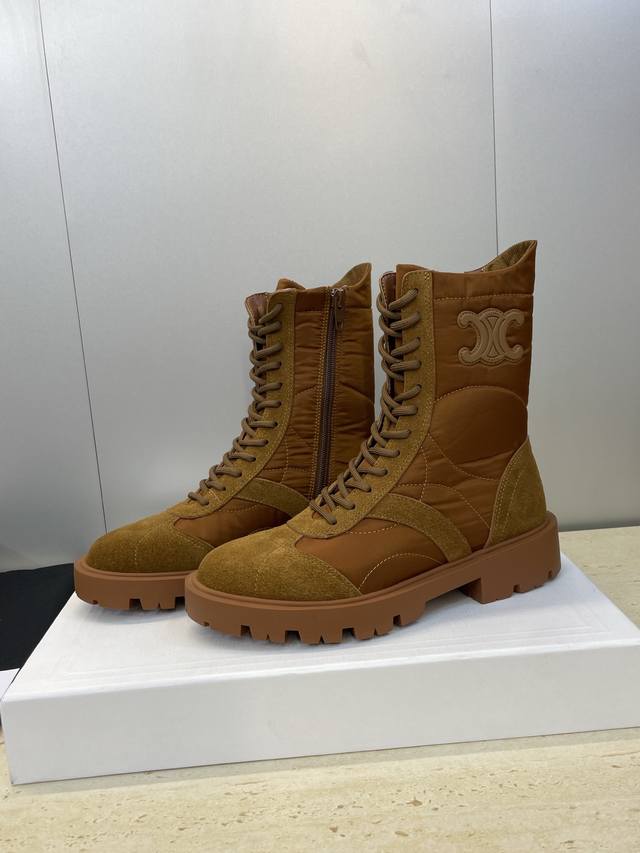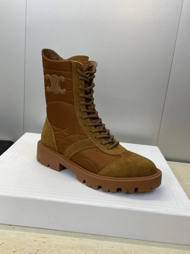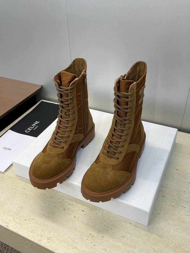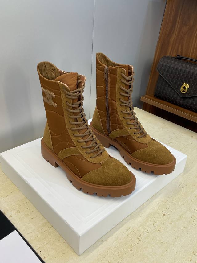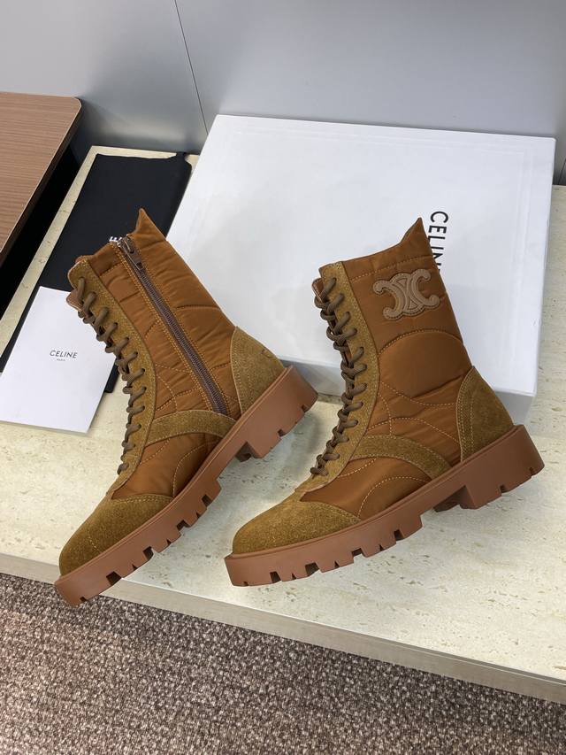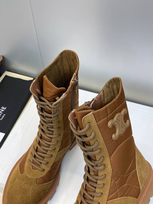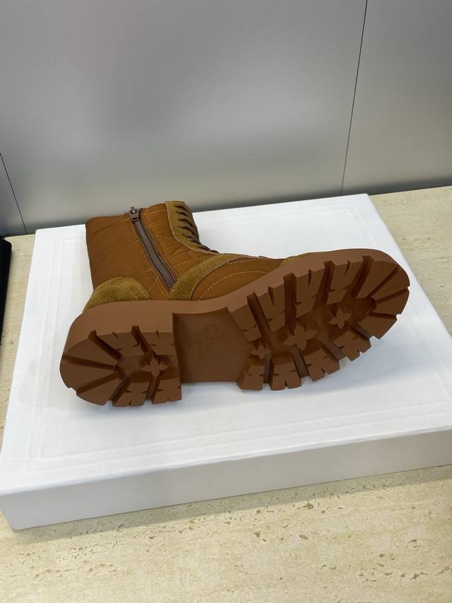 / 工厂P价P Celine 2025秋冬新款系带机车女短靴 瑟琳字母Logo厚底低跟圆头拼色骑士登山靴 材质:鞋面定制进口牛猄皮 环保透气帆布+水染牛皮垫脚+原版