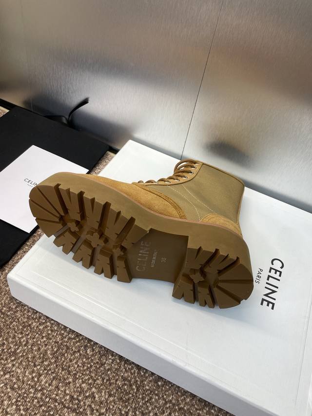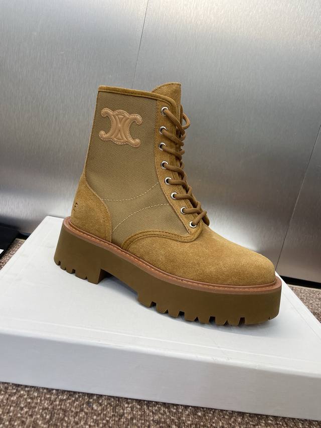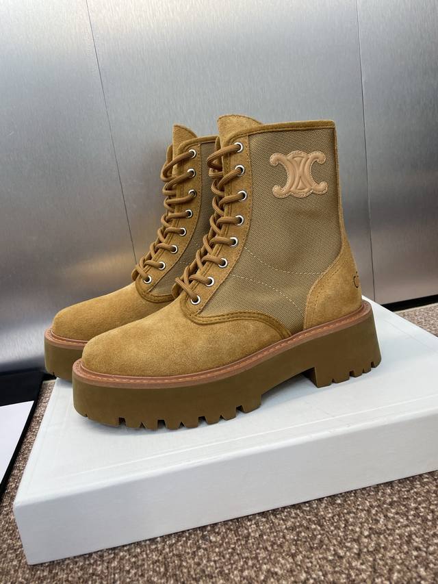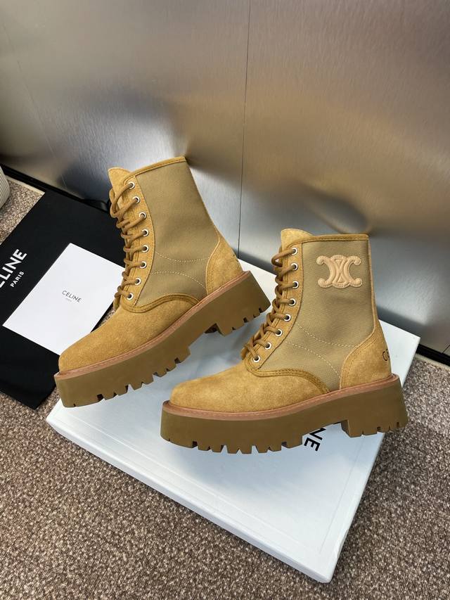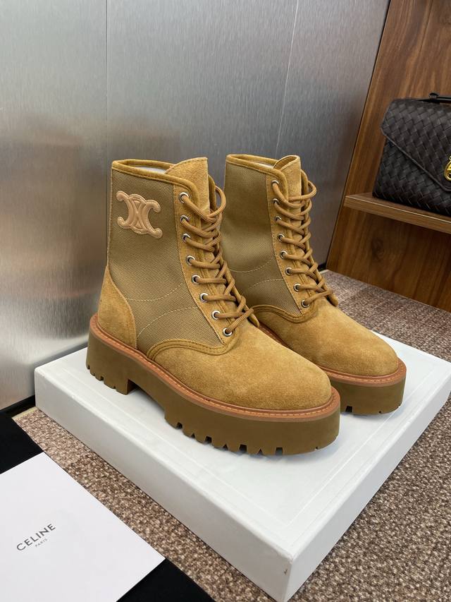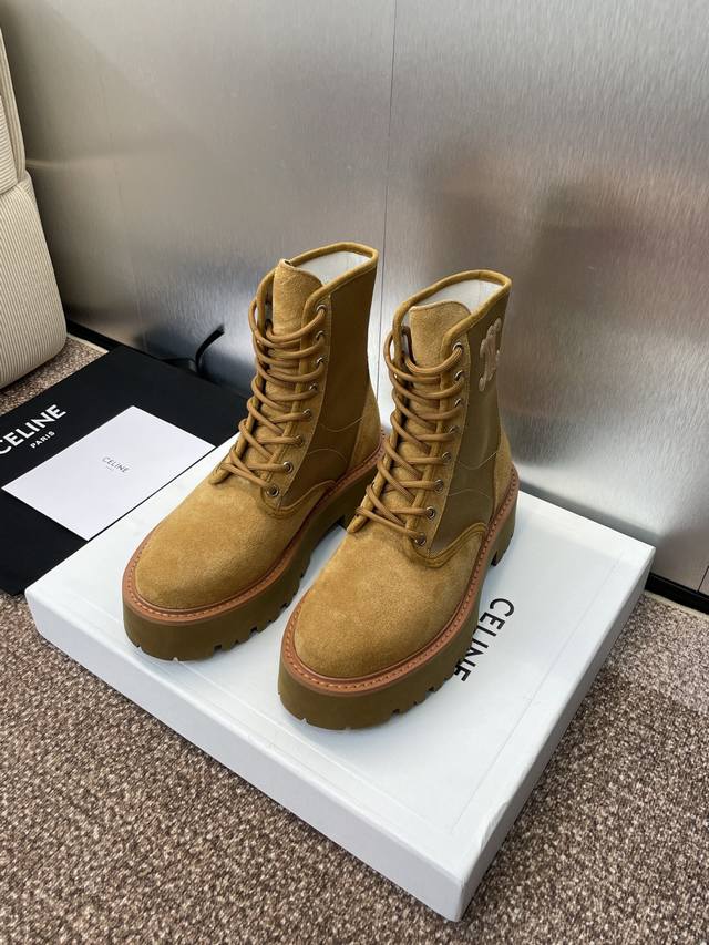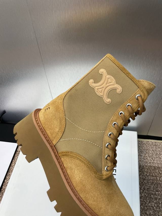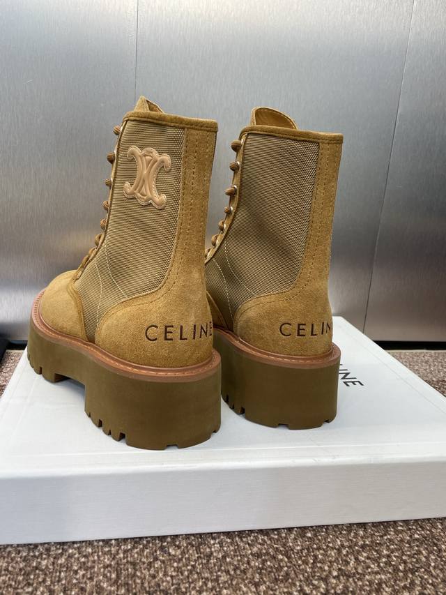 Celine 2025秋冬新款系带机车女短靴 瑟琳字母Logo厚底低跟圆头拼色骑士登山靴