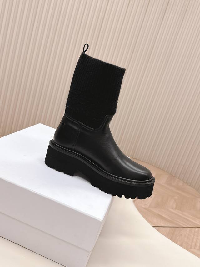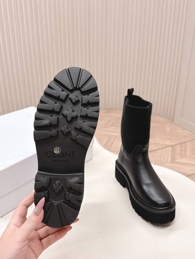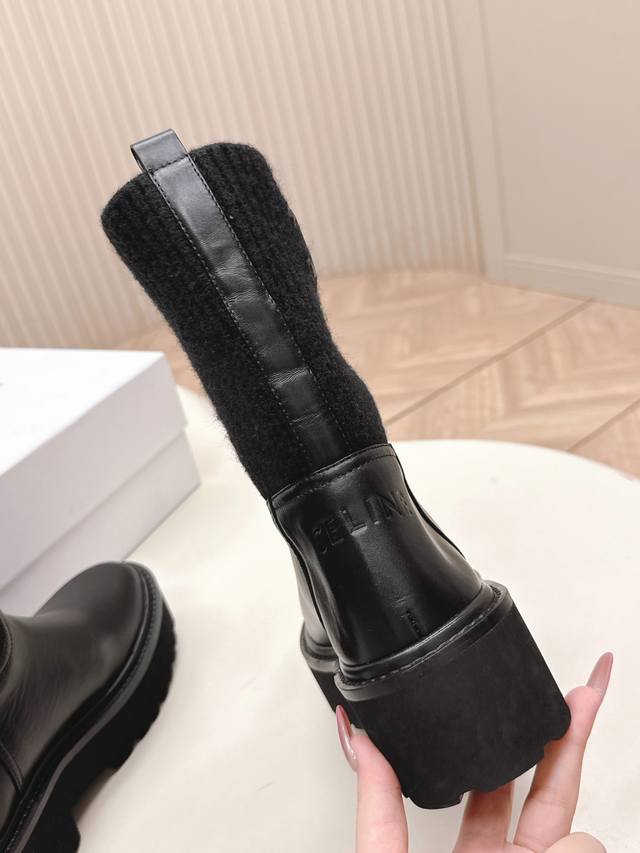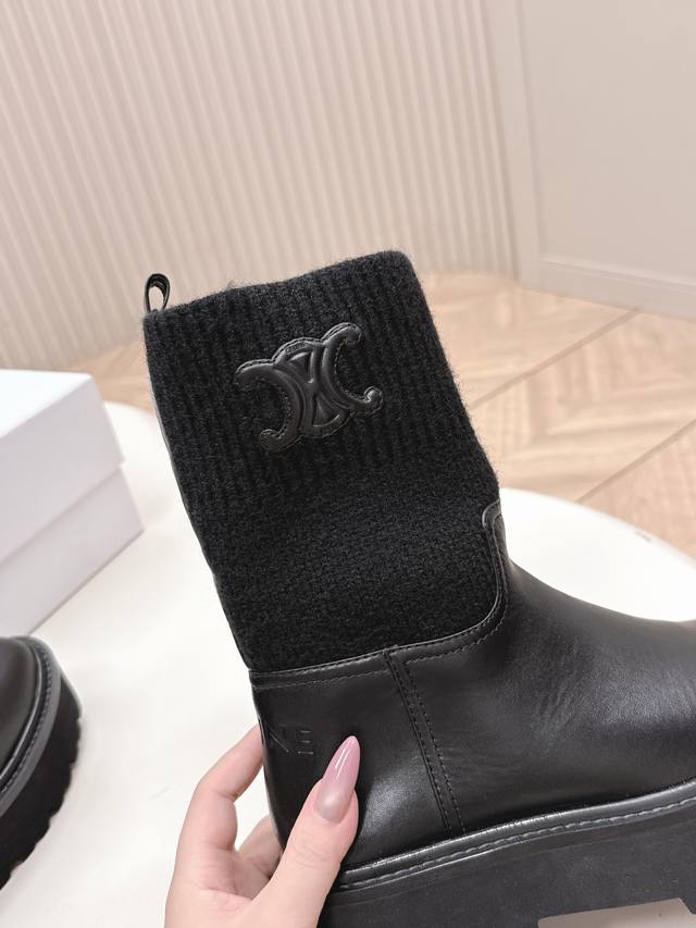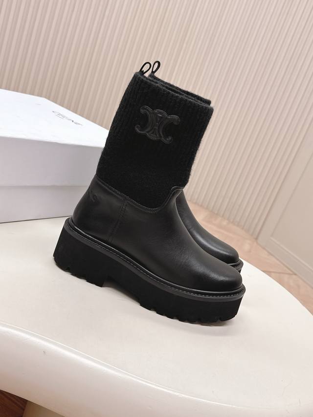 / 短款 Celine 思琳新款 经典凯旋门毛线筒祙子厚底牛皮短靴 超级显气质增高显瘦款 女王的绝佳搭配!简约时尚又俏皮懒人毛线袜子 鞋面:牛皮 内里:牛皮 原版底