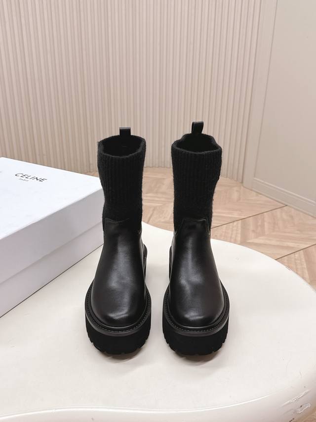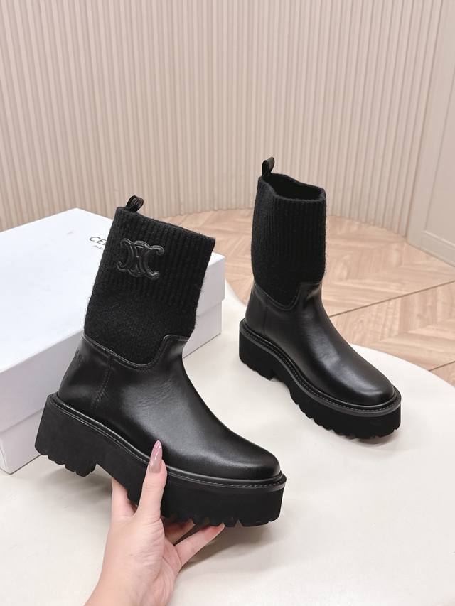 短款 Celine 思琳新款 经典凯旋门毛线筒祙子厚底牛皮短靴 超级显气质增高显瘦款 女王的绝佳搭配!简约时尚又俏皮懒人毛线袜子 鞋面:牛皮 内里:牛皮 原版底! Size:#35-40 40订做不退换