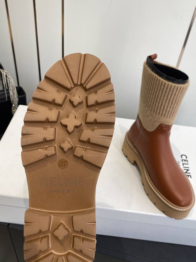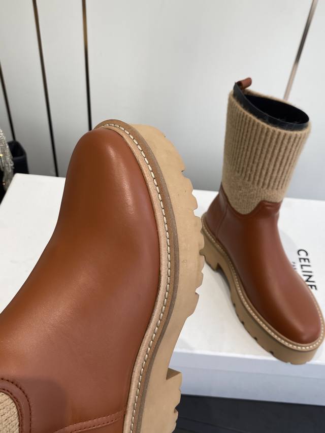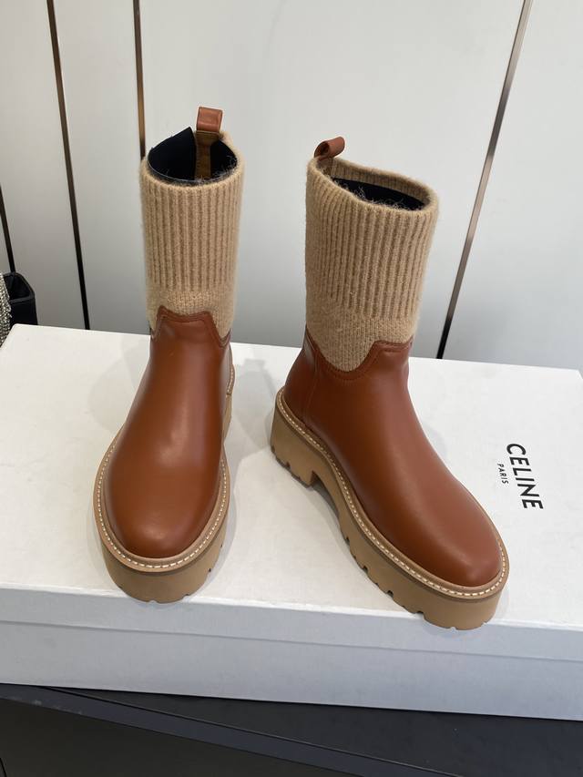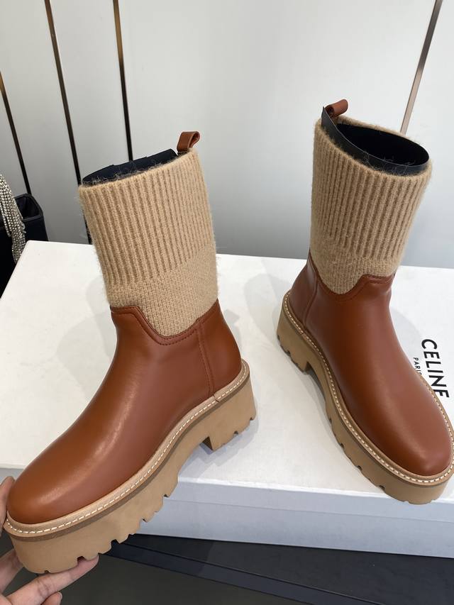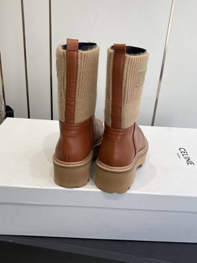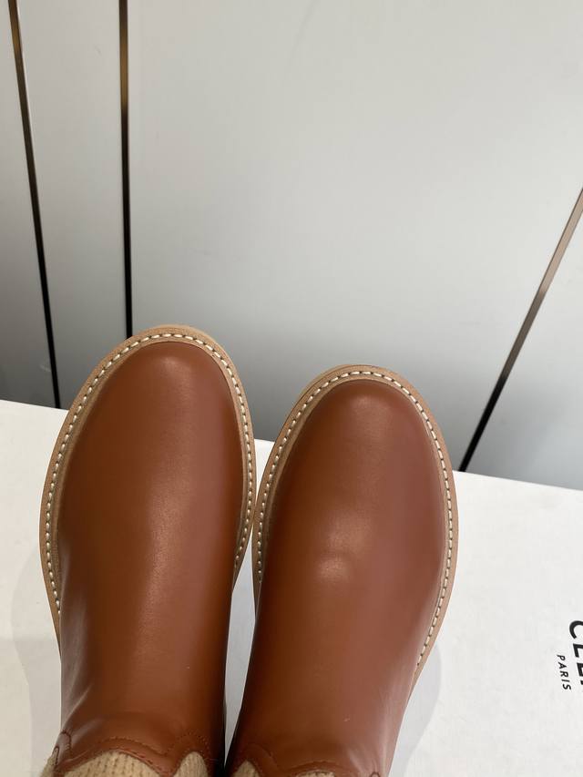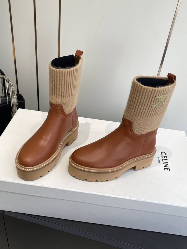 高筒款 Celine 思琳新款 经典凯旋门毛线筒祙子厚底牛皮短靴 超级显气质增高显瘦款...