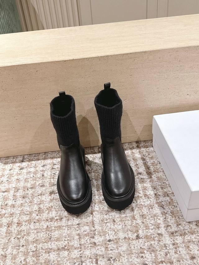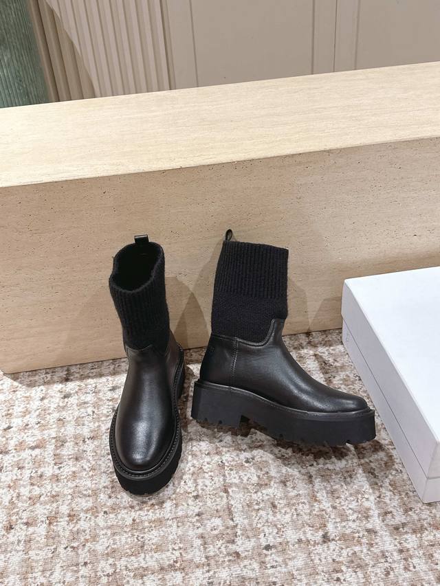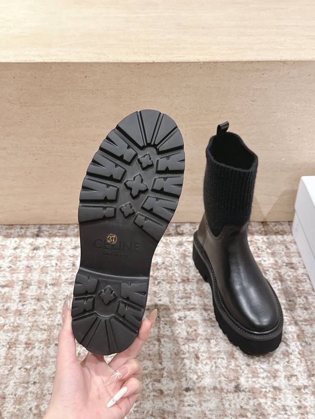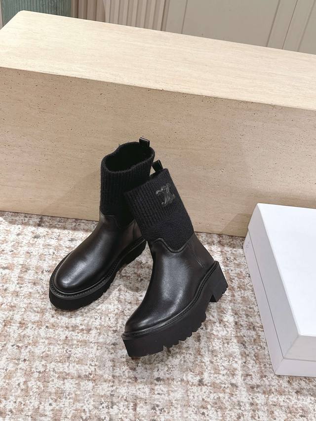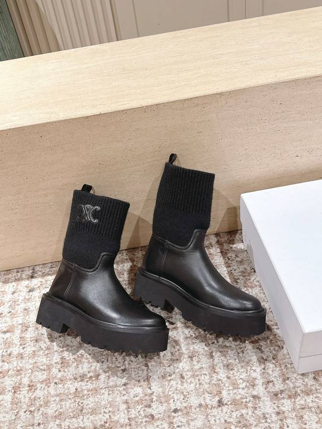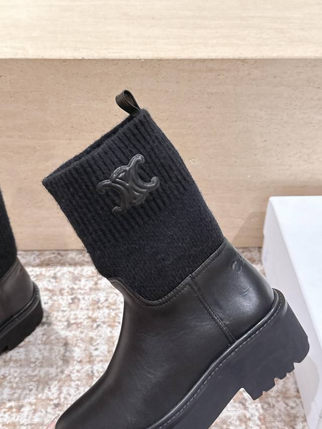 高筒款 Celine 思琳新款 经典凯旋门毛线筒祙子厚底牛皮短靴 超级显气质增高显瘦款...