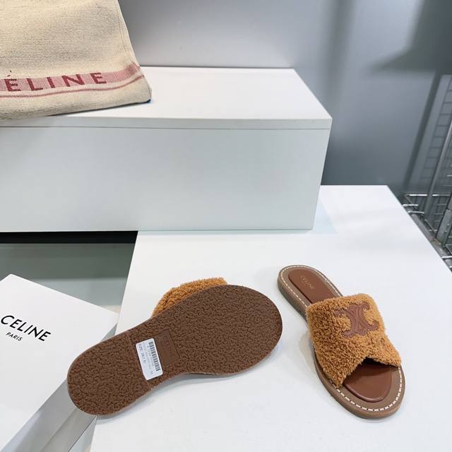 高品质出厂 !顶级品质Celine赛琳25秋冬新品凯旋门简易平底毛呢拖鞋! 随性慵懒搭配也太酷了吧! 休闲中带着小性感搭配短裤或长裙都超有范儿经典凯旋门标志高级