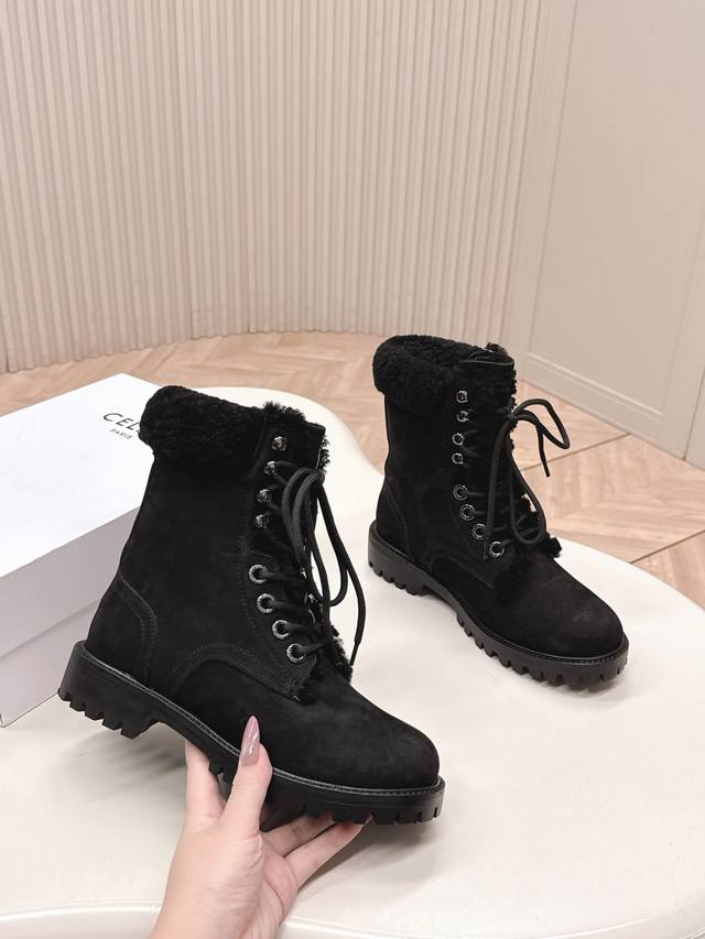 高版 羊毛款 出 Celine 经典马丁靴 大黄靴 复古圆头战靴 又帅又酷 复古做旧 鞋面采用进口牛反绒,质感超级奈斯,内里羊毛,原版一比一开模大底!上脚非常舒适 大头的设计,妥妥的增高神器 Size: 35-40