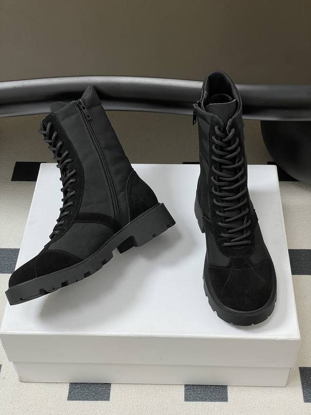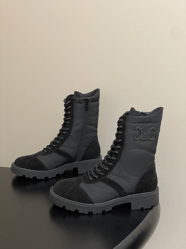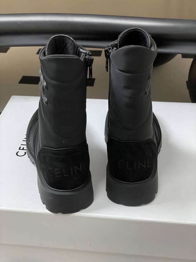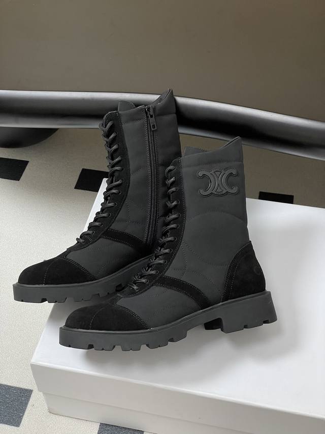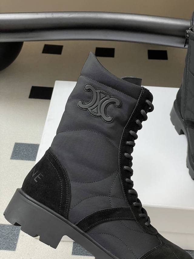 25Fw秋冬新款 Celine 赛琳 凯旋门复古厚底马丁靴短靴侧拉链机车风短靴 当英伦硬朗邂逅巴黎优雅,这双马丁靴以复古之形 写就当代格调。侧面Triomphe皮标浮雕如时光印记,将品牌底蕴凝于方寸之间。厚底橡胶大底兼具稳健与增高力,经典系带设计穿梭复古脉络。皮革衬里与软垫鞋领碰撞出舒适触感,打破硬靴的刻板印象。无论是搭配条纹羊毛开衫演绎慵懒法式,还是与皮革单品碰撞酷帅锋芒,亦或混搭连衣裙平衡柔美与硬朗,它都能成为造型核心。 鞋面:定制面料拼接牛反绒 内里垫脚:羊皮 鞋底:原版开模橡胶防滑大底 码数:35