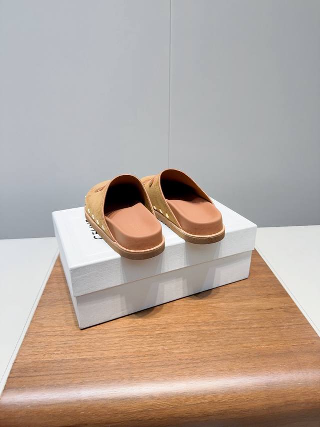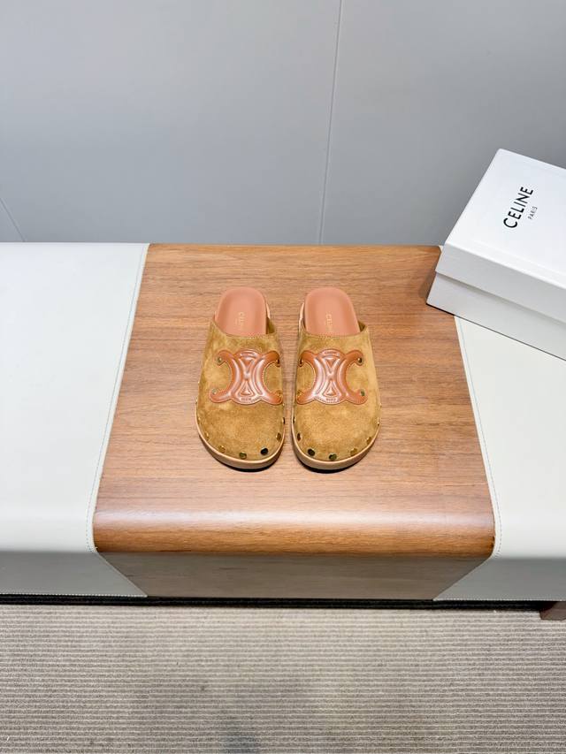 Celin- 赛琳 凯旋门 25Ss 春夏新款 勃肯 包头拖高级感十足 网红Ins种草神器、非常复古风、气场十足单品、设计风格非常新颖、高档且非常舒适.压印Celine标志彰显品牌魅力面料:原版进口麂皮 内里:羊毛 大底:原版超轻发泡大底Size: 35-40 40女定做不退换