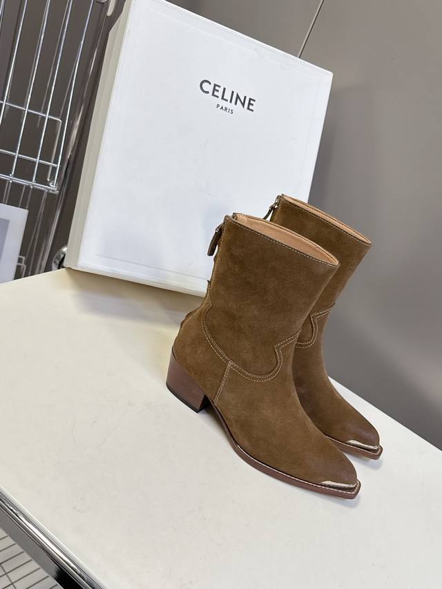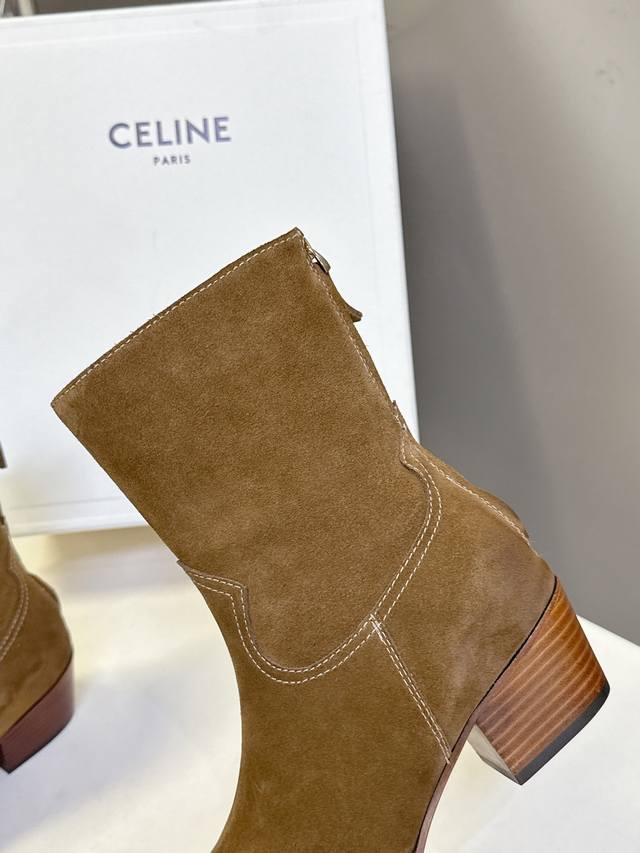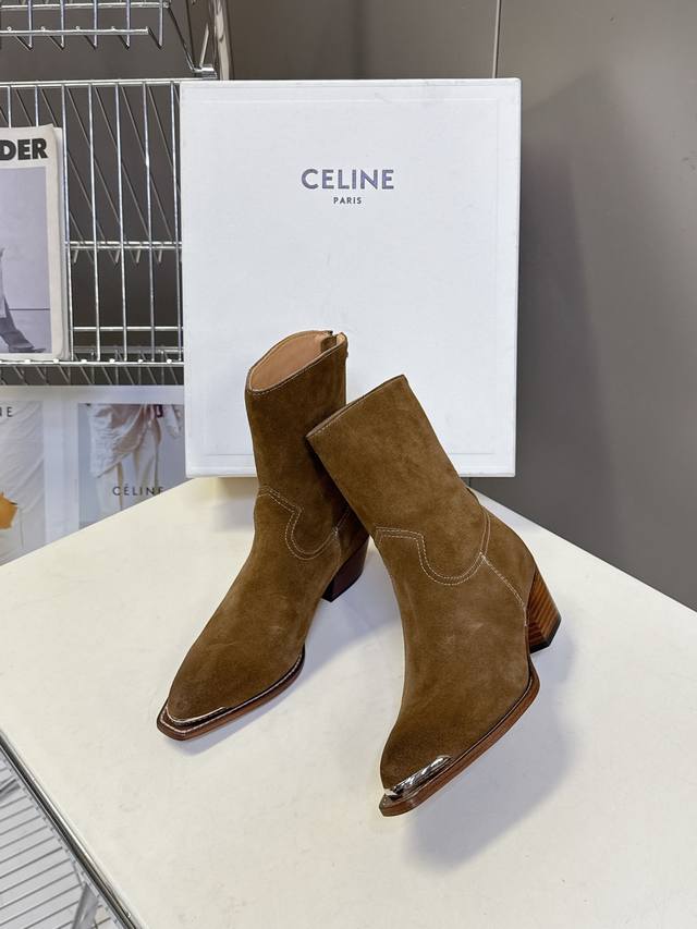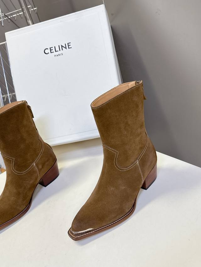 Celine专柜最新时装靴、走秀款时尚博主同款 早秋力推单品!复古欧美风格 炸街必备单品 凯旋门Logo点缀 非常高端有气质 四季可穿的短靴、鞋面:采用原版定制