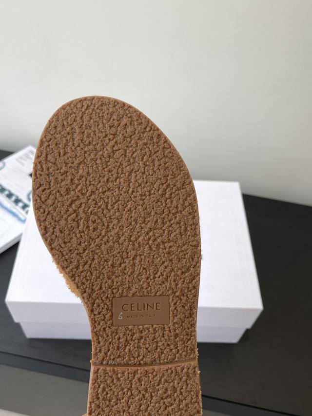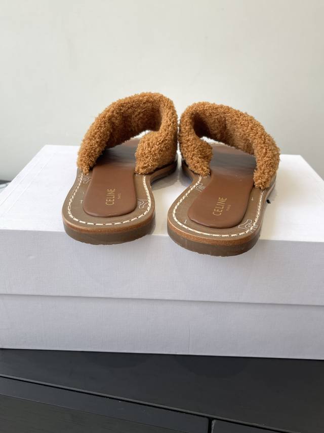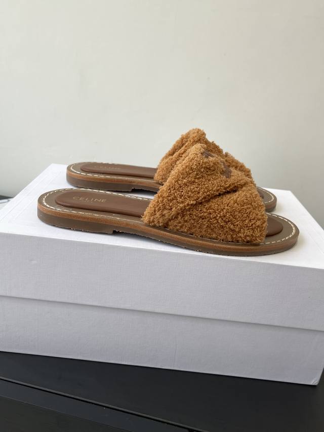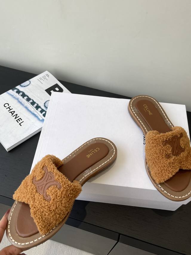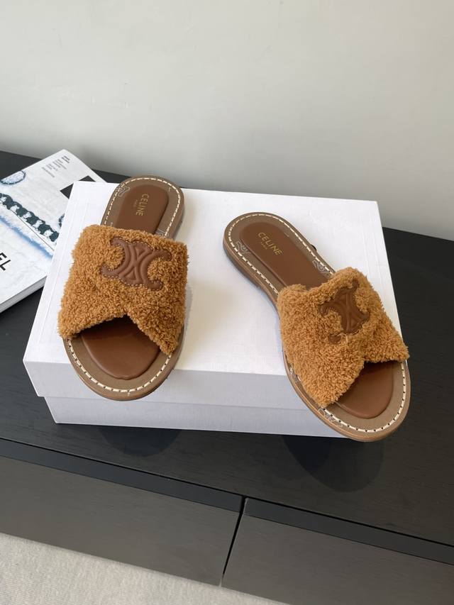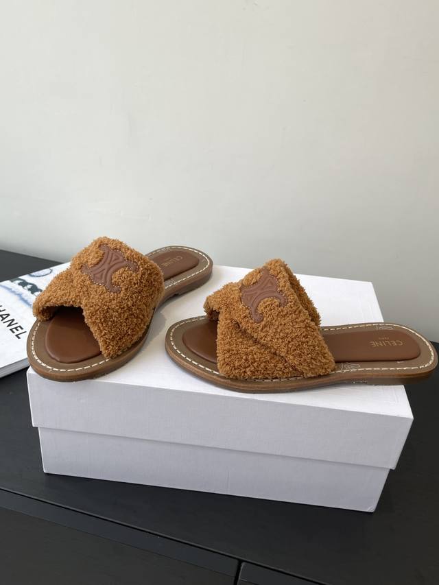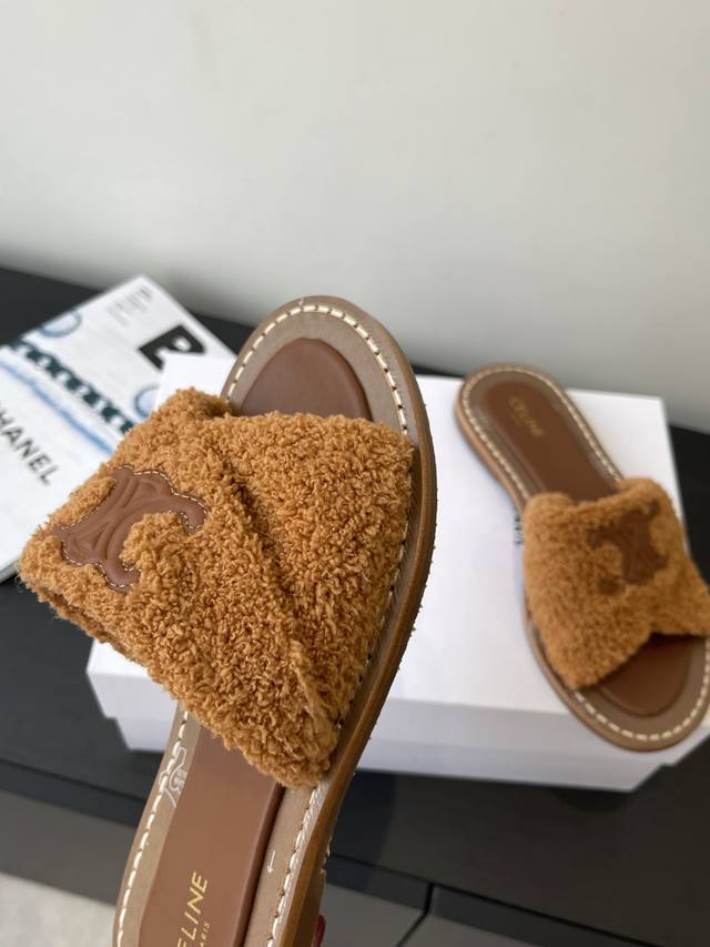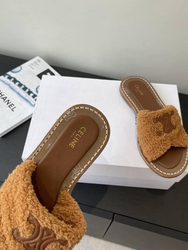Celine塞琳 25Ss新款 凯旋门英伦风平底微标羊毛拖鞋