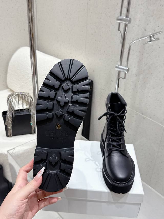 Celine 塞琳.真皮厚底马丁靴 系带短靴|经典与质感的双重奏 DDD 黑色款全皮质感拉满,Triomphe压纹尽显辨识度,厚底酷飒又显高;焦糖棕款撞色设计复古吸睛,细腻皮革触感高级。无论是搭配街头风还是法式穿搭,都能轻松拿捏风格,是秋冬鞋柜里的硬核单品~ DDD 底厚:4.5Cm DDD 正码:35-42 DDD