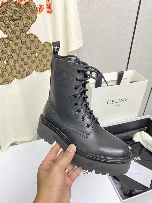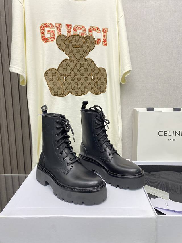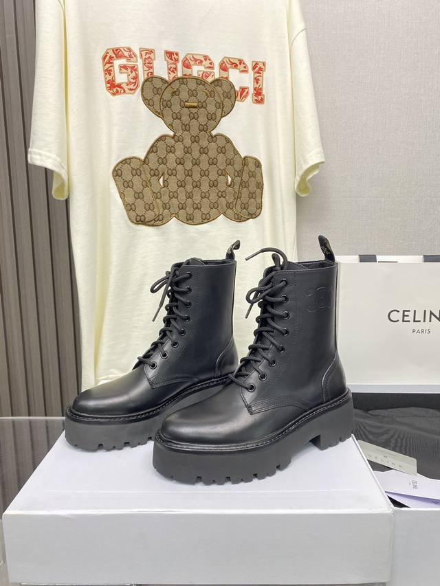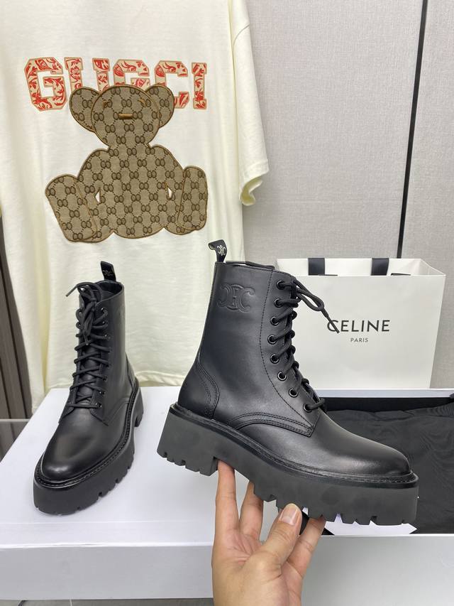 工厂P价P Celine 2025秋冬新款系带机车女短靴 瑟琳字母压花Logo厚底低跟圆头骑士登山靴材质:鞋面定制进口小牛皮...